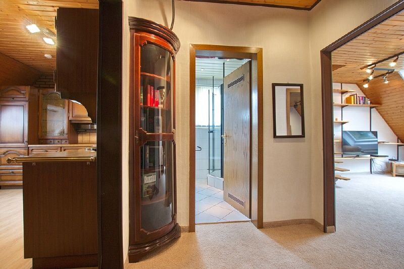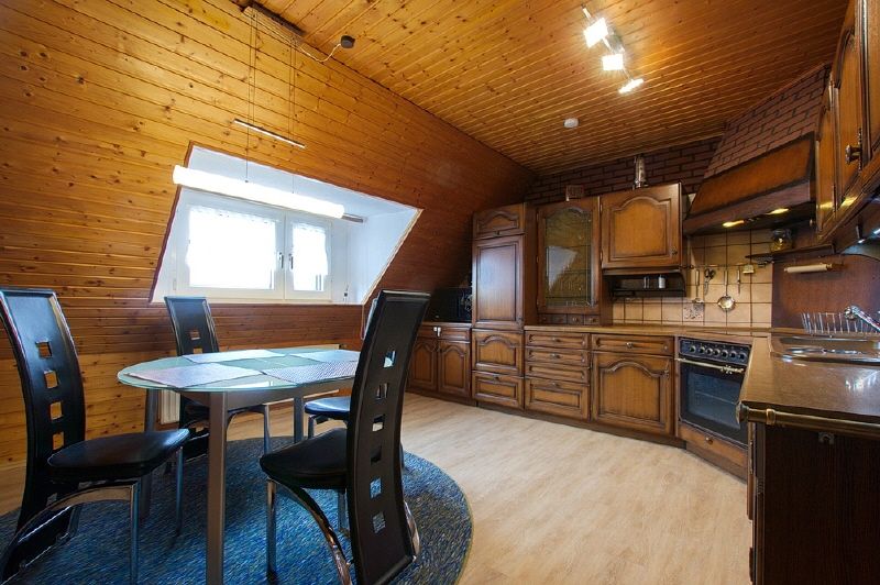 Komplette Ausstattung, ein Internetzugang kann auf Wunsch gegen Kostenübernahme zur Verfügung gestellt werden. Große Wohnküche inklusive Inventar, Spülmaschine und mit Essplatz für bis zu vier Personen. Wohnzimmer mit Ledercouchgarnitur, TV-Gerät (kann mit Fire-TV-Stick internetfähig genutzt werden) und Regalen. Schlafzimmer mit Doppelbett (1,60 x 2 Meter) und geräumigem Kleiderschrank. Spitzboden mit weiterer Schlafgelegenheit, Kleiderschrank und Schreibtisch. Badezimmer mit WC, Waschtisch, Dusche und Fenster. Bei Bedarf steht eine Waschmaschine inklusive Waschmittel für € 5,- wöchentlich zur Nutzung zur Verfügung.
