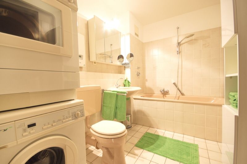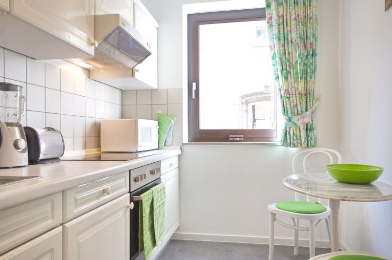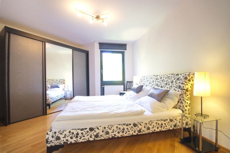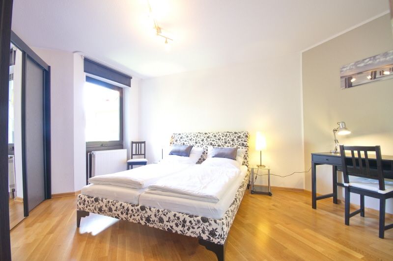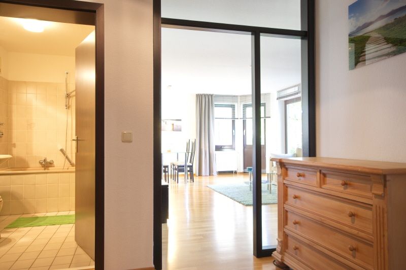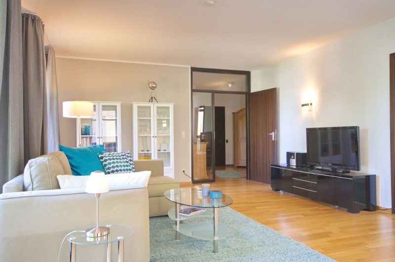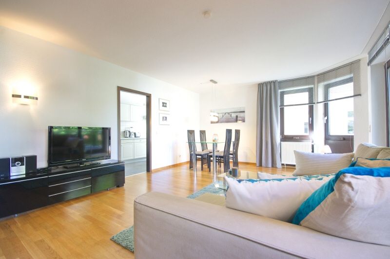 Moderne und komplette Ausstattung. Eingangsdiele mit Garderobenschrank, Kommode und Abstellraum. Großzügiges Wohnzimmer mit Ecksofa (Schlaffunktion), Lowboard, Flachbild-TV mit Kabelanschluss, ausziehbarer Esstisch mit vier Stühlen. Ausgang zum Balkon mit Blick auf den begrünten Innenbereich der Bebauung. Balkonmöbel aus Echtholz sind vorhanden. Die Küche ist mit einer weißen Einbauküche ausgestattet, diese beinhaltet Kühl- und Gefrierschrank, Spülmaschine, Herd mit Dunstabzug sowie Geschirr etc. Ein kleiner Frühstücks-Essplatz ist ebenfalls eingerichtet. Schlafzimmer mit Doppelbett und großem Schiebetüren-Kleiderschrank sowie Schreibtisch. Das Wannenbad mit Duscharmatur und -trennwand ist hellbeige gefliest, Waschmaschine, und Trockner stehen zur Verfügung. Internet inklusive.