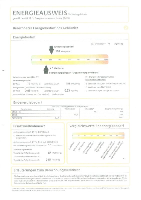 Angaben zum Energieausweis: Baujahr des Hauses: 1985, Energiebedarfsausweis Wert: 106 kWh/(m²a), Energieträger: Fernwärme.