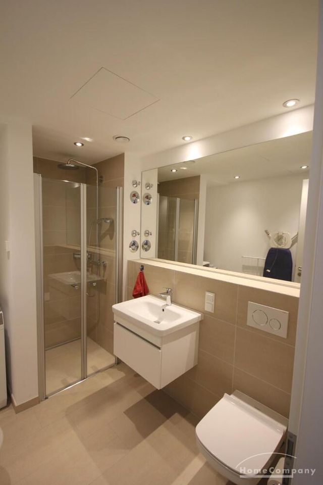 modernes, stylisches Duschbad mit Waschmaschine und Waschtrockner