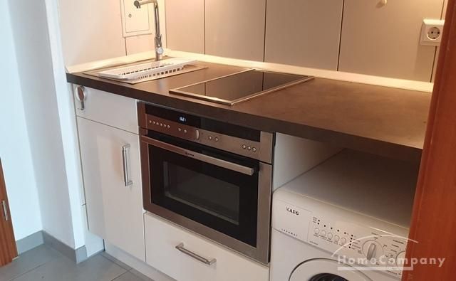 Offene Küchenzeile im Eingangsbereich, komplett ausgestattet mit kleiner Waschmaschine.