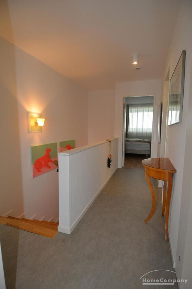 Eine elegante Echtholztreppe führt in das obere Geschoss, wo sich die Wohnbereiche harmonisch über zwei Ebenen verteilen. Das großzügige Badezimmer ist mit einer Badewanne, einer separaten Dusche sowie einem Doppelwaschbecken ausgestattet; zusätzlich steht ein Gäste-WC zur Verfügung. Eine praktische Kammer bietet zusätzlichen Stauraum.
