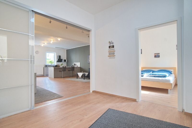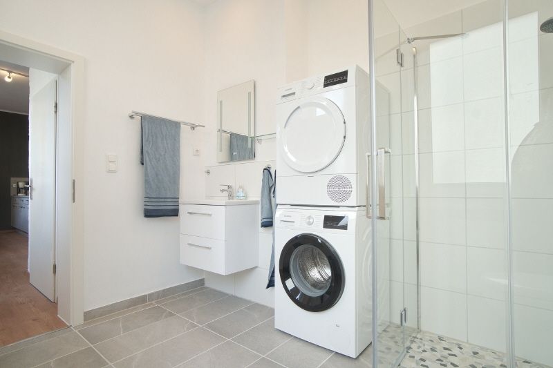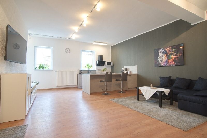 Neu und komplett eingerichtete Wohnungmit vollständigem Inventar. Großer Wohnraum mit Essbereich und offen integrierter Küche. Im Wohnbereich steht ein Sofa mit Schlaffunktion, es gibt ein 65 “-TV-Gerät mit Internet-Anbindung. Esstisch mit vier Stühlen, neue Einbauküche inklusive Spülmaschine, Kühlschrank mit Eisfach, Ceranfeld, Backofen, Microwellen-Grill-Gerät sowie Komplettausstattung mit Geschirr und Kochutensilien, Kaffeemaschine etc. Das Schlafzimmer ist mit einem 1,60 Meter breiten Bett und Kleiderschrank möbliert, die Fenster haben Rolläden. In einem Abstellraum stehen Staubsauger, Wäscheständer, Bügelutensilien und ein Regal bereit. Das Duschbad ist sehr hell und neu eingebaut, Waschmaschine und Wäschetrockner (neue Siemens-Geräte) sind vorhanden. Komplettausstattung inklusive Bettzeug, Bettwäsche und Handtüchern.