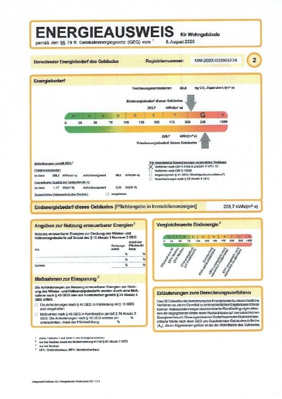 Angaben zum Energieausweis: Baujahr des Hauses: 1900, Energiebedarfsausweis, Wert: 205,7 kWh/(m²a), Energieträger: Erdgas.