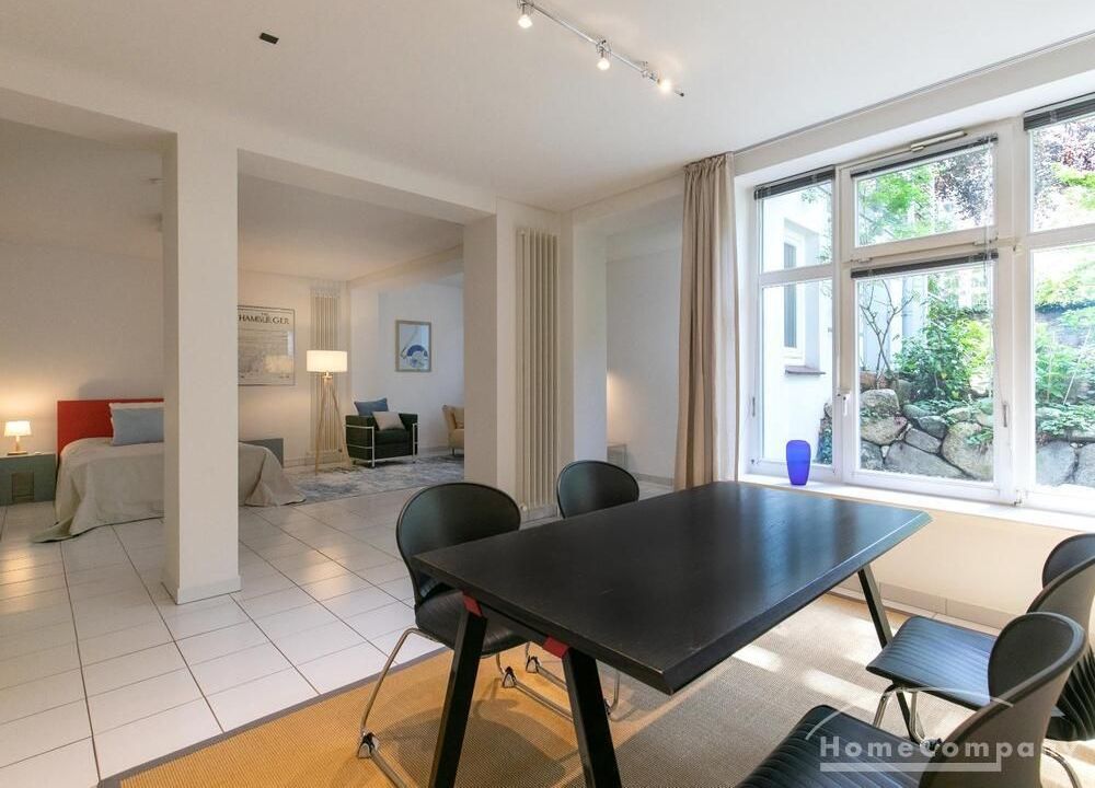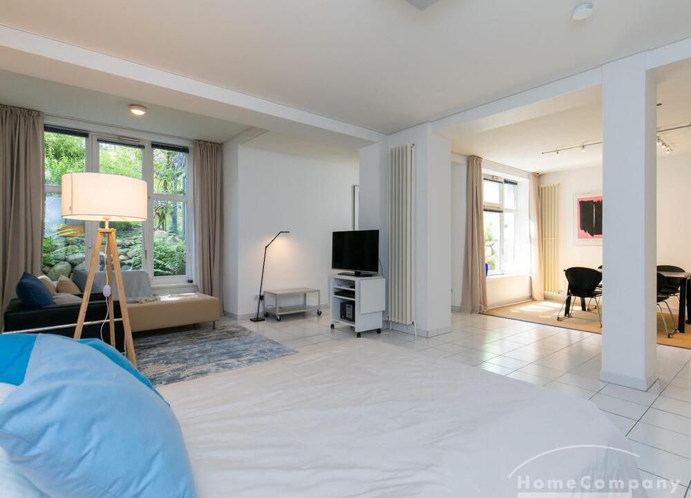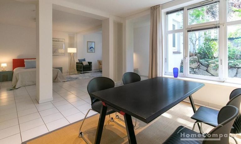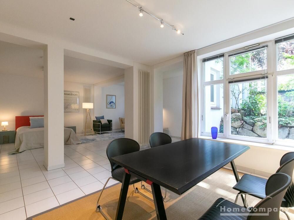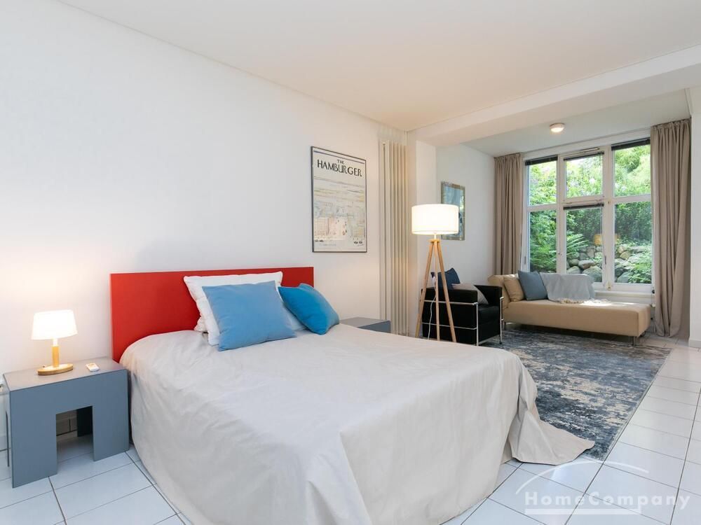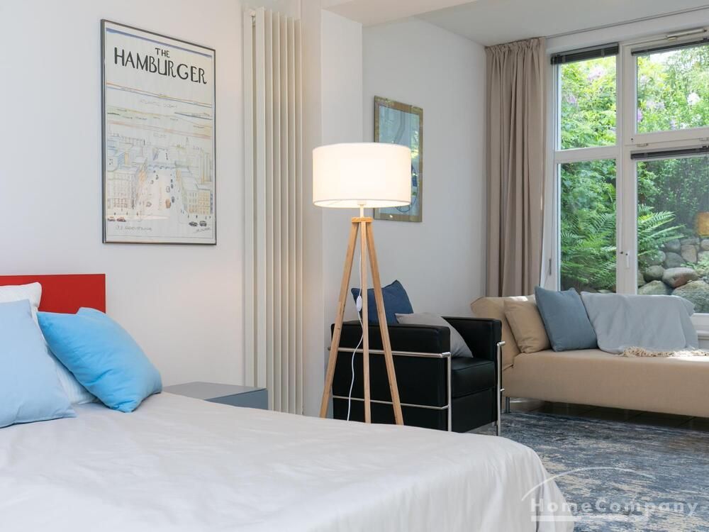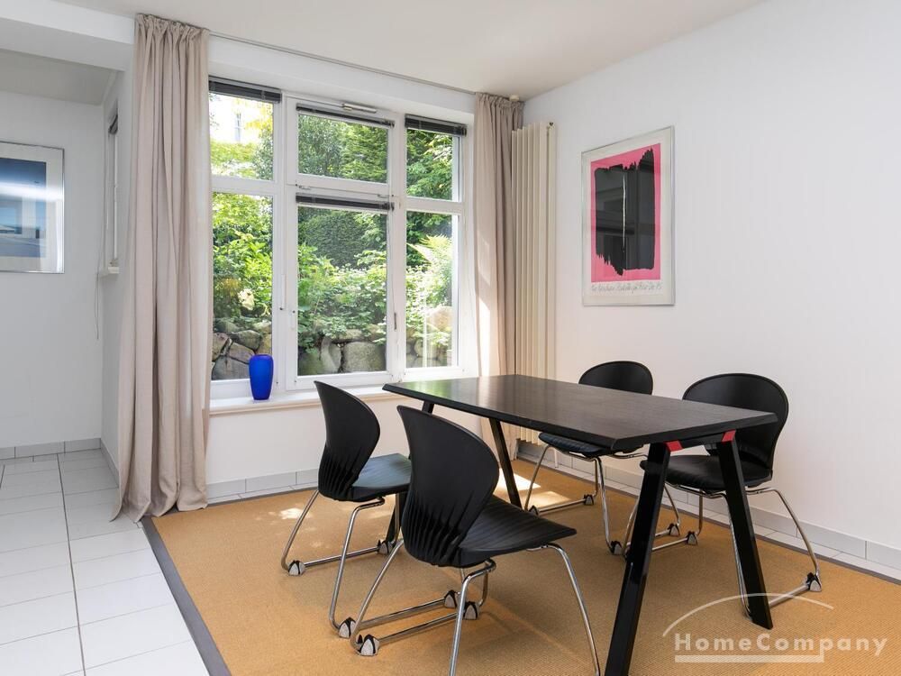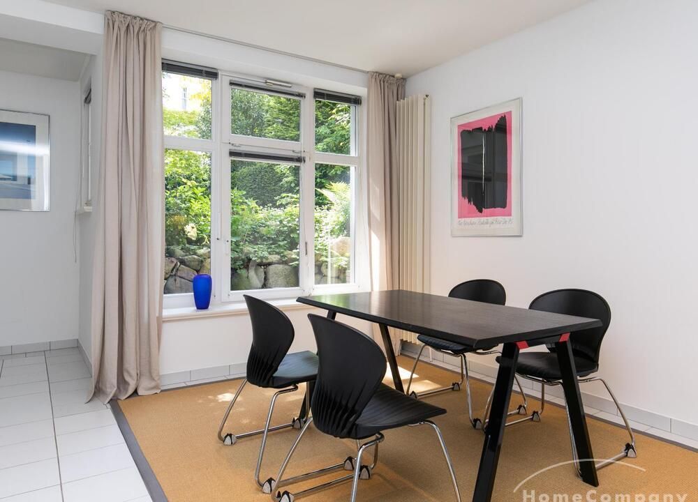 Komfortabel eingerichtete Souterrain-Wohnung im Loftstil in einer Harvestehuder Jugendstil Stadtvilla mit großen Fenstern zum ruhigen Garten. Die Wohnung hat ein modernes, helles Ambiente und ist in bester Wohn-/Adressenlage in Alsternähe (500 m zur Außenalster, 150m zum Alsterlauf) und in der Nähe der beliebten Eppendorfer und Winterhuder Einkaufs- und Gastronomieszene gelegen. Die Wohnung ist modern möbliert und mit einer hochwertigen Einbauküche sowie einem großzügigen Duschbad ausgestattet. Ein Waschtrockner steht zur Verfügung. Ein 100 cm Flachbildschirm (Kabel-TV), DVD-Player und Stereoanlage stehen zur Verfügung. Der Schlafbereich ist mit einem 1,40m breiten Bett ausgestattet.