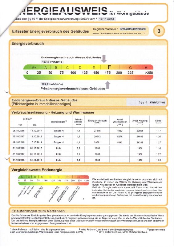 Angaben zum Energieausweis: Baujahr des Hauses: 1901, Energieverbrauchsausweis, Wert: 167,4 kVVh/(m²a), Energieträger: Erdgas, Energieeffizienzklasse gemäß Energieausweis und EnEV 2014: F
