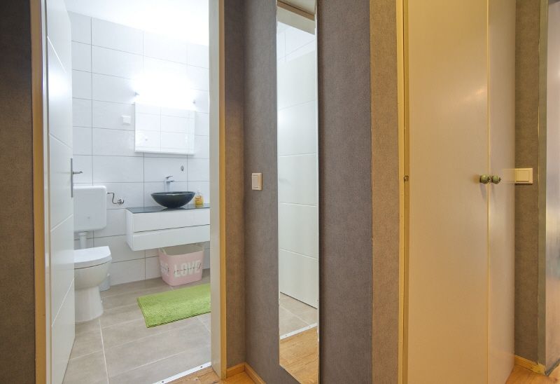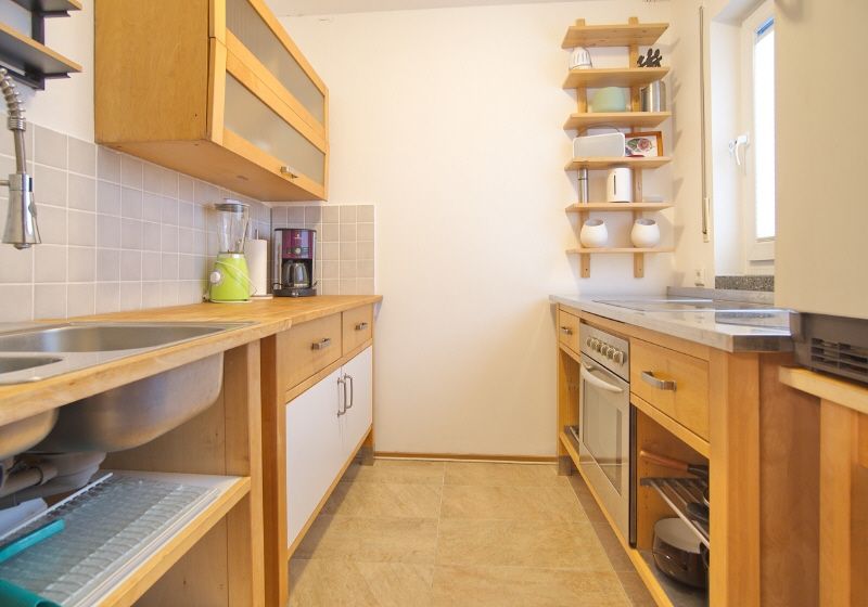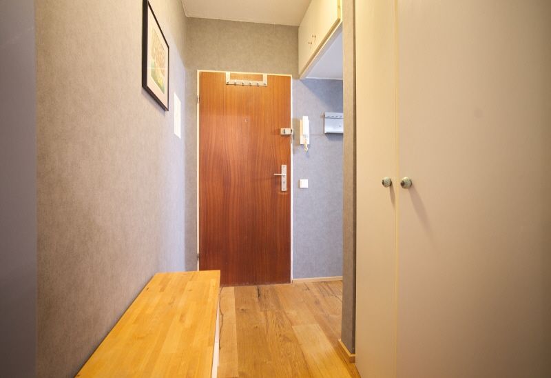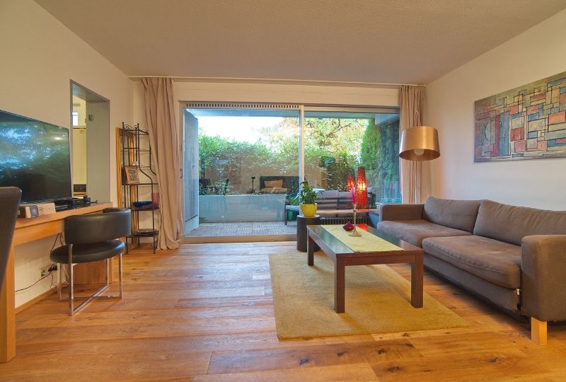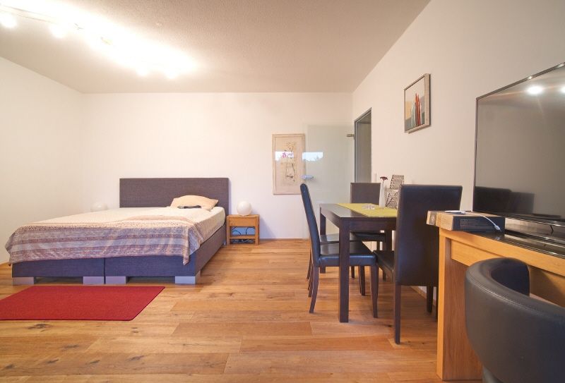 Großzügiger Wohn-Schlafraum mit Echtholz-Bodenbelag, große Schiebetüre zur teilüberdachten Terrasse. Gartenmöbel mit Polstern (Bank und zwei Stühle) stehen bereit. Die Möblierung des Wohnraums besteht aus einem großen Doppelbett, Esstisch mit Stühlen, einem großen Sofa und TV-Gerät (wird aktuell erneuert), weiterhin ein Massivholz-Schubladenschrank und ein Regal. Zugang zur kleinen Küche, diese ist mit einem Kühlschrank, Cerankochfeld, Backofen, Kaffeemaschine, Toaster, Geschirr und Kochutensilien ausgestattet. In der Diele befindet sich ein Einbauschrank für Kleidung und Taschen. Zur Wohnung gehört ein hell gefliestes Badezimmer mit Wanne und Duschvorrichtung. Bettzeug, Bettwäsche und Handtücher sind vorhanden. Eine Waschmaschine steht im Waschkeller auf der gleichen Etage bereit, daneben liegt ein Trockenraum.