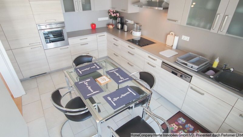 Aufgeteilt in hellen Wohn-/Essbereich mit Balkonzugang sowie Küche mit weiterem Essbereich & Balkonzugang,