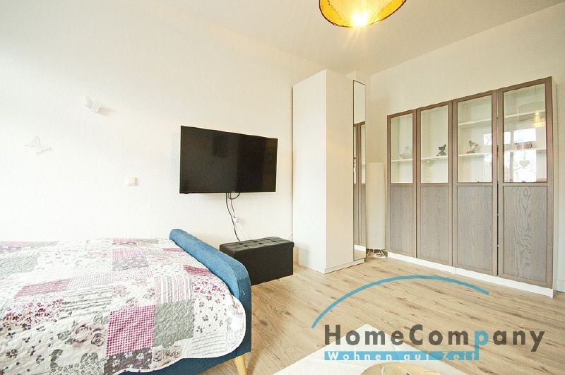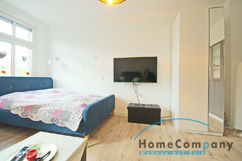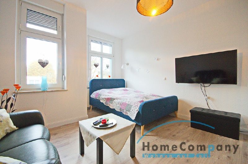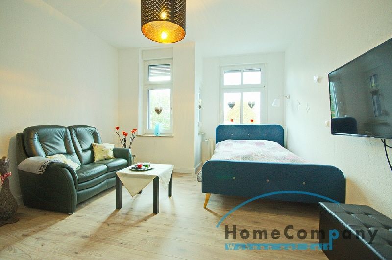 Neu renoviert: Schöne aufgearbeitete Türen (Altbau), schicker Laminatboden. Vollständige Möblierung und Inventar werden in die Wohnung eingebracht. Das Wohnschlafzimmer verfügt dann über ein großes Bett (1,80 x 2,00 M), TV-Gerät (Flachbild) mit Kabel-Empfang und Internetzugang, Kleiderschrank, Vitrinenschrank, Sofa und einen Tisch. Die Fenster haben Rolläden. Große Wohnküche mit einem Essplatz, die Einbauküche ist ausgestattet u.a. mit: Backofen mit Ceranfeld, großem Kühlschrank mit Eisfach, Kaffeemaschine, Spülmaschine sowie Geschirr. Das hell geflieste Badezimmer hat eine Badewanne mit Duschvorrichtung und Glastrennwand. Eine Waschmaschine steht dem Mieter im Keller zur Nutzung zur Verfügung.