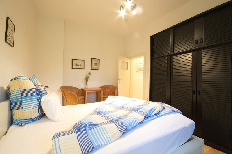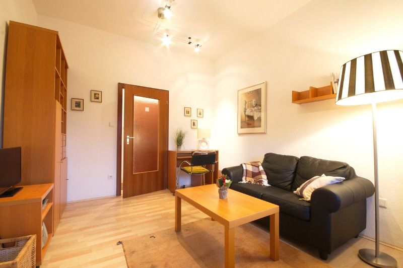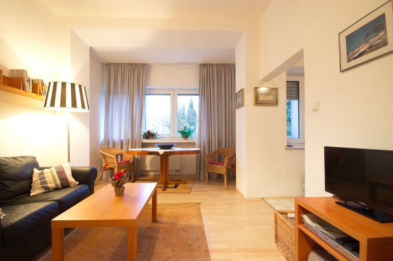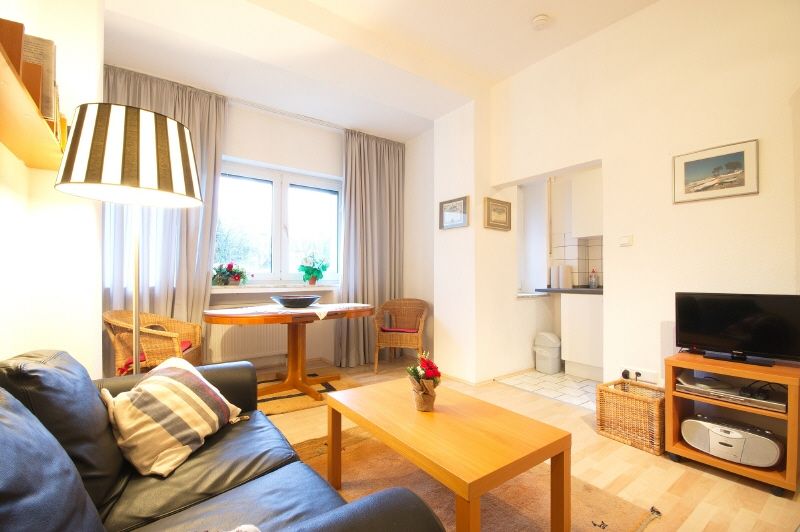 Komplette Ausstattung. Wohnzimmer mit Ledersofa, Kabel-TV, Schreibtisch. Doppelbett und viertüriger Kleiderschrank im Schlafzimmer. Bettwäsche und Handtücher werden gestellt. Kleine Küche mit neuer Singleküche, Microwelle, Ceranherd, Geschirr. Hell gefliestes Duschbad mit Fenster. Eine Waschmaschine im Haus steht zur Nutzung zur Verfügung.