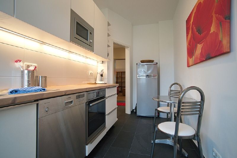 Hochwertiger Bodenbelag mit Echtholz-Dielenparkett und Naturstein-Fliesen. Neues Duschbad mit Glastüre, wandhängendes WC, Waschbecken und Unterschrank, in der kleinen Zwischendiele vor dem Bad befindet sich die Waschmaschine. Küche mit Einbauküchenzeile inklusive Ceran-Doppelkochfeld, Backofen, Microwelle, Spülmaschine, Kühl-Gefrier-Kombination. Ein Bistrotisch mit zwei Stühlen steht bereit. Gemütliches Wohnzimmer mit Sofa (Schlaffunktion), großes TV-Gerät (internetfähig), Tisch und Stühle. Die zwei Schlafzimmer sind mit Betten, Kleiderschrank und kleinem Schreibplatz mit Stuhl möbliert. Internetzugang ist über W-LAN vorhanden.