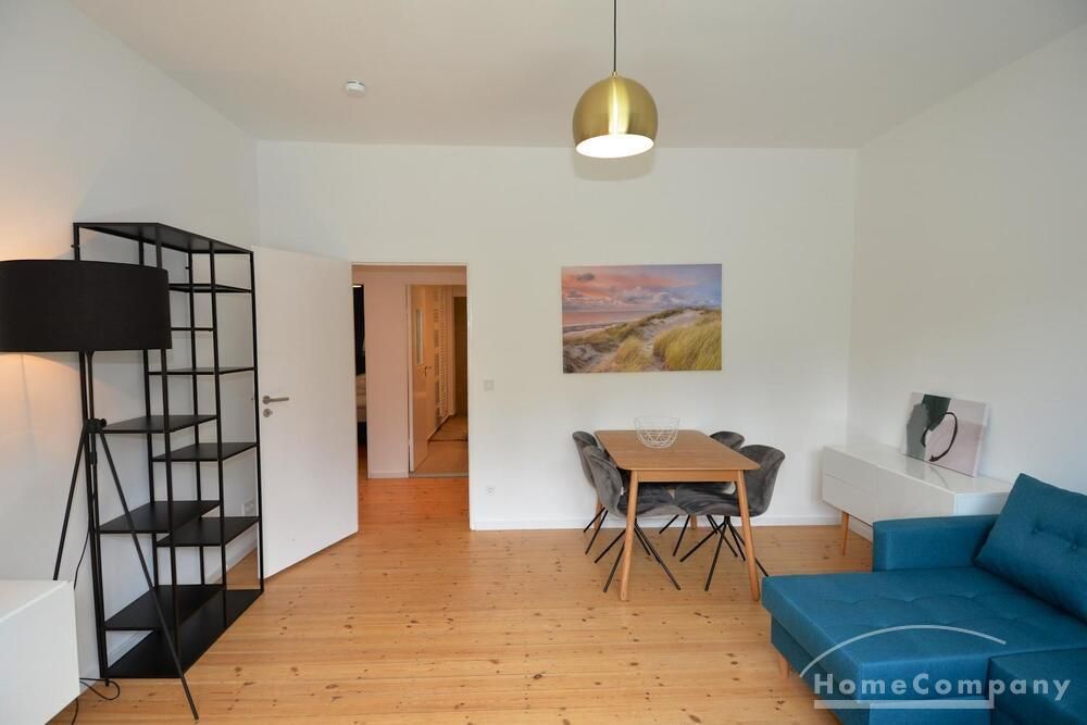 Schöne Zwei-Zimmer-Wohnung in der Nähe des Parks Rehberge in Berlin. Die Wohnung ist möbliert und verfügt über ein Schlafzimmer und ein Wohnzimmer. Waschmaschine und Geschirrspüler sind vorhanden. Im Wohnzimmer gibt es einen Essbereich und ein großes, gemütliches Sofa. Die Küche ist sehr geräumig und bietet einen weiteren, kleinen Esstisch.