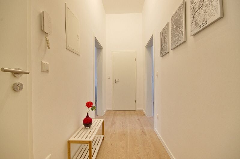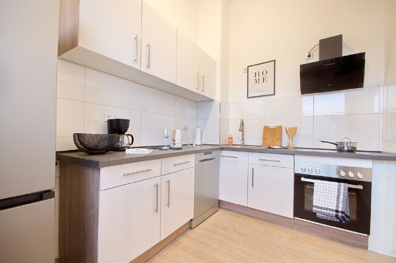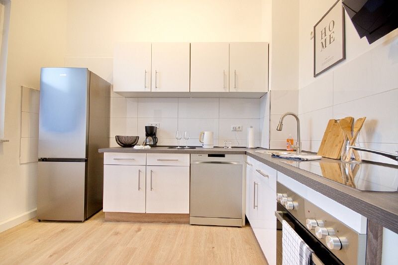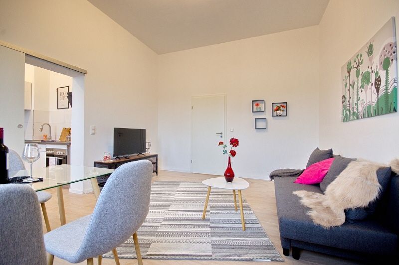 Die Wohnung ist schick-modern und ansprechend möbliert und komplett ausgestattet. Bodenbelag, Fenster, Heizung und Badezimmer sind neu. Im Wohnzimmer gibt es ein Sofa mit Schlaffunktion, ein TV-Gerät (internetfähig) und einen Essbereich mit Tisch und Stühlen. Nebenan liegt die Küche mit einer vollständig eingerichteten Einbauküche inklusive Spülmaschine, Ceranherd mit Dunstabzug, Microwelle, Kühl-Gefrier-Kombination und Kücheninventar. Das Schlafzimmer verfügt über ein Doppelbett und einen Kleiderschrank. Das Duschbad ist weiß gefliest und mit einer Handtuchheizung ausgestattet. Eine Gemeinschafts-Waschmaschine im Haus kann genutzt werden.