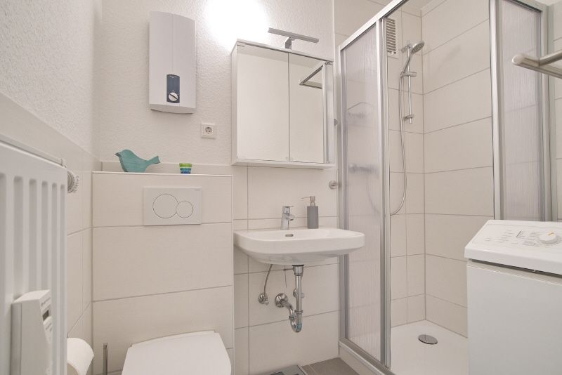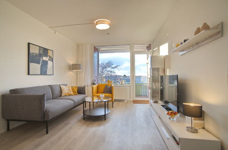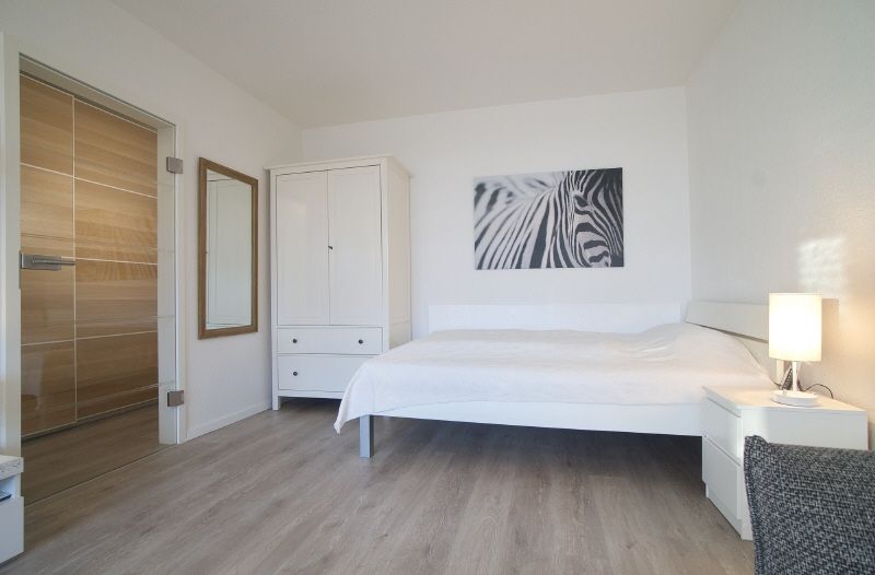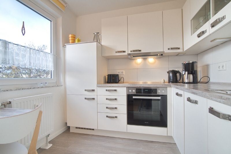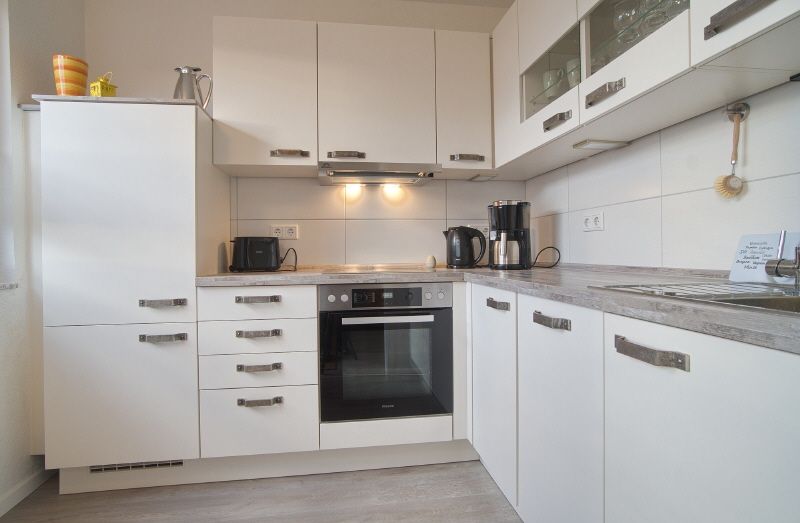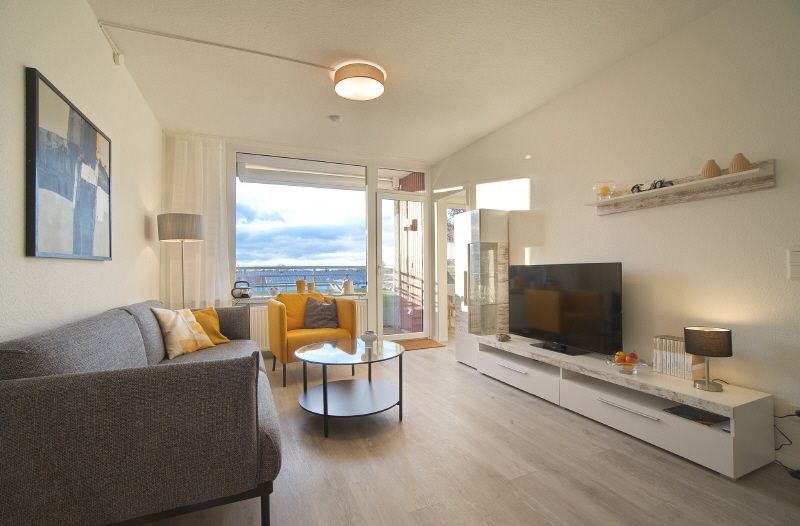 Geschmackvoll zusammengestelltes Mobiliar, vollständige Ausstattung mit Kücheninventar, Wäsche etc. Wohnbereich mit neuem Sofa und Sessel sowie Couchtisch, großem neuem TV-Gerät (internetfähig), W-LAN. Zugang zum Balkon mit elektrischer Markise und Abstellraum, Tisch und Stuhl sind vorhanden. Die separate Küche ist mit einer Einbauküche inklusive Spülmaschine, Kühlschrank, Gefrierschrank, Herd etc. sowie Geschirr ausgestattet. Hier gibt es einen kleinen Essplatz. Im Schlafbereich steht ein 1,40 Meter breites Bett bereit, ein Kleiderschrank dort und ein großer Schrank in der Diele bieten viel Stauraum. Zur Wohnung gehört ein hell gefliestes Duschbad mit Spiegelschrank und einer Toplader-Waschmaschine.