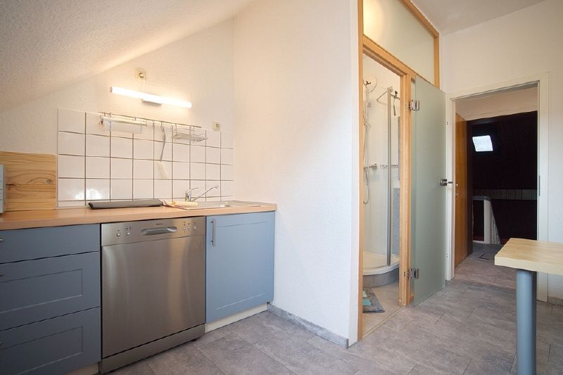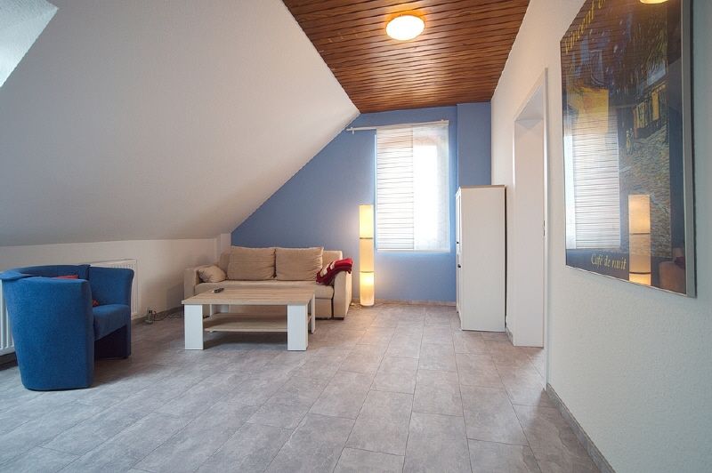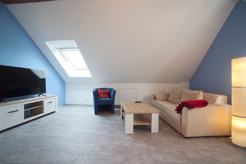 Neuer Bodenbelag, überwiegend neues Mobiliar. Komplette Ausstattung inklusive Bettzeug, Wäsche, Geschirr etc. Internetzugang ist über W-LAN möglich. Wohnzimmer mit Sofa und großem TV-Gerät (SAT-Anschluss + Smart-TV, 55 „), Sessel, Lowboard und Kommode. Separate Küche mit Einbauküche, diese beinhaltet eine Spülmaschine, ein Cerankochfeld und einen Backofen. Weiterhin gibt es eine Microwelle, Kühlschrank mit kleinem Eisfach, eine Senseo-Kaffeemaschine und einen Essplatz. Von der Küche abgeteilt ist ein kleines Duschbad mit Waschbecken. Die Toilette ist separat und von der Diele aus begehbar. Waschmaschine im Keller des Hauses. Schlafzimmer mit 1,40 m breitem Bett, Kleiderschrank und Regal. Im Treppenhaus vor der Wohnungseingangstüre sind Garderobe und Schuhschrank zur Wohnung untergebracht.