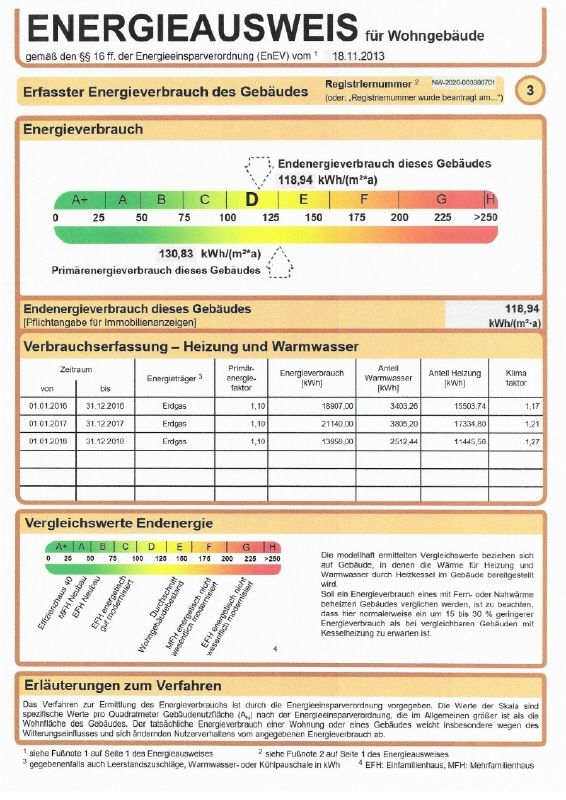 Angaben zum Energieausweis: Baujahr des Hauses: 1904, Baujahr Wärmeerzeuger 2015. Energieverbrauchsausweis, Wert: 118,94 kWh/(m²a), Energieträger: Erdgas, Energieeffizienzklasse gemäß Energieausweis und EnEV 2014: D.