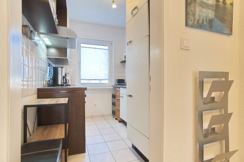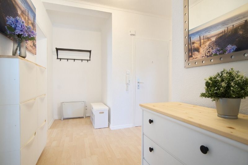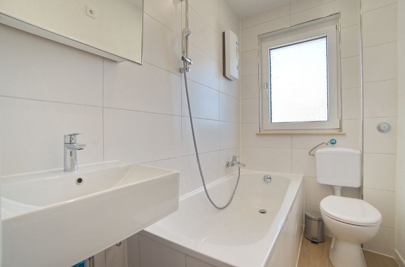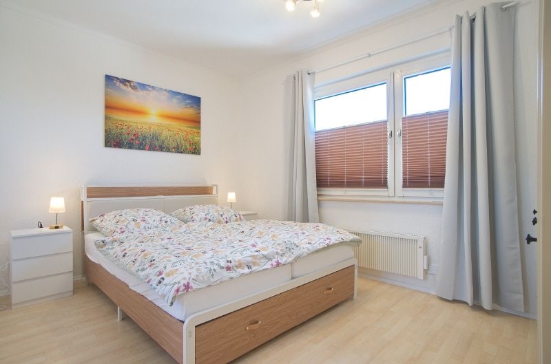 Internetzugang ist vorhanden, neuer 55″ Hisense-SmartTV mit USB-Anschlussmöglichkeit. Wohnesszimmer mit gemütlichem Sofa und Regal, schöner Esstisch für bis zu vier Personen. Die kleine separate Küche beinhaltet eine Spülmaschine, Ceranherd mit Backofen und Dunstabzug, einen großen Kühlschrank und ein Gefrierfach sowie Kaffeemaschine, Wasserkocher, Geschirr, Töpfe/Pfannen und Kochutensilien. Schlafzimmer mit Doppelbett und Kleiderschrank, das zweite Schlafzimmer ist mit einem ausziehbaren Tagesbett (80 cm/1,60 m Breite), einem Schrank und kleinem Arbeitsplatz möbliert. Zur Wohnung gehört ein helles, neu gefliestes Bad mit Fenster, Wanne und Spiegelschrank, die Beheizung erfolgt über einen neuen, sehr effizienten Heizlüfter. In der zentralen Diele gibt es eine Garderobe, Schuhschränke und eine Kommode. Eine Waschmaschine und Platz zum Aufhängen der Wäsche gibt es im Keller.