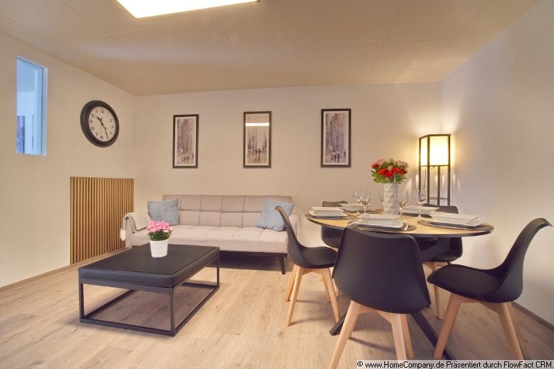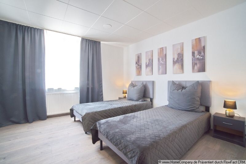 Diese Wohnung ist vollständig möbliert und bietet eine stilvolle sowie komfortable Einrichtung, die keine Wünsche offen lässt. Zwei Schlafzimmer sind mit jeweils zwei Einzelbetten (90 x 200 cm) ausgestattet, die bei Bedarf flexibel zusammengestellt werden können, um als Doppelbett zu dienen. Das dritte Schlafzimmer ist mit einem Einzelbett (90 x 200 cm) möbliert. Außerdem stehen in jedem Zimmer ausreichend Stauraum und ansprechende Möbel zur Verfügung. Die moderne Küche in elegantem Schwarz-Matt-Design ist komplett ausgestattet und überzeugt durch Funktionalität. Zur Ausstattung gehören ein Backofen, ein Cerankochfeld, ein Kühlschrank, eine Kaffeemaschine und viele weitere praktische Küchengeräte, die den Alltag erleichtern. Der offene Wohn- und Essbereich lädt zum Verweilen ein. Er ist mit einer Schlafcouch (1,40 x 2 m) ausgestattet, die zusätzliche Schlafmöglichkeiten bietet, sowie einem großzügigen Esstisch, an dem bequem mehrere Personen Platz finden. Ein Fernseher mit Smart-Funktion sorgt für Unterhaltung und rundet die moderne Einrichtung ab. Ein zusätzlicher Pluspunkt ist der Waschraum im Haus, in dem sich eine Waschmaschine zur gemeinschaftlichen Nutzung befindet. Eine Internetzugang ist im Mietpreis enthalten.