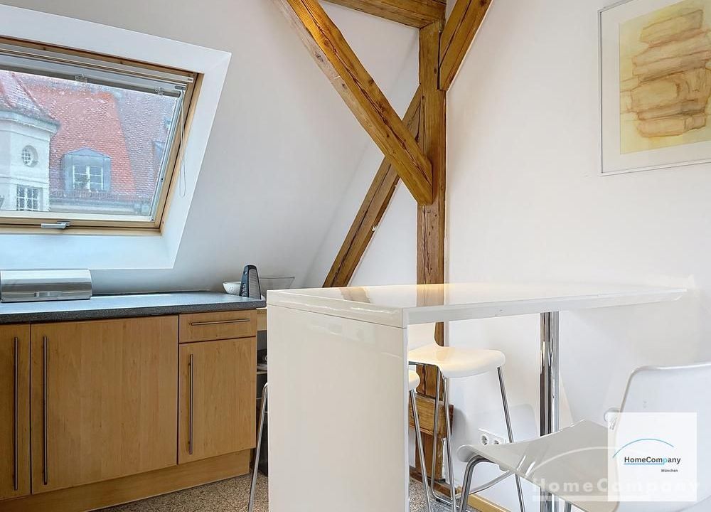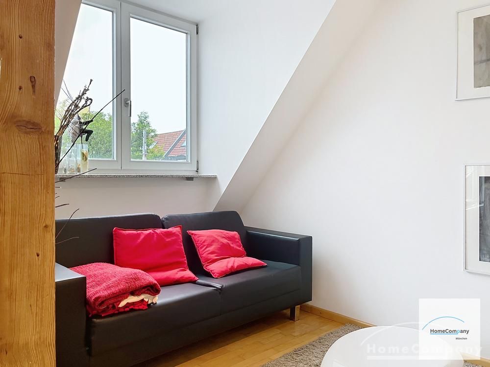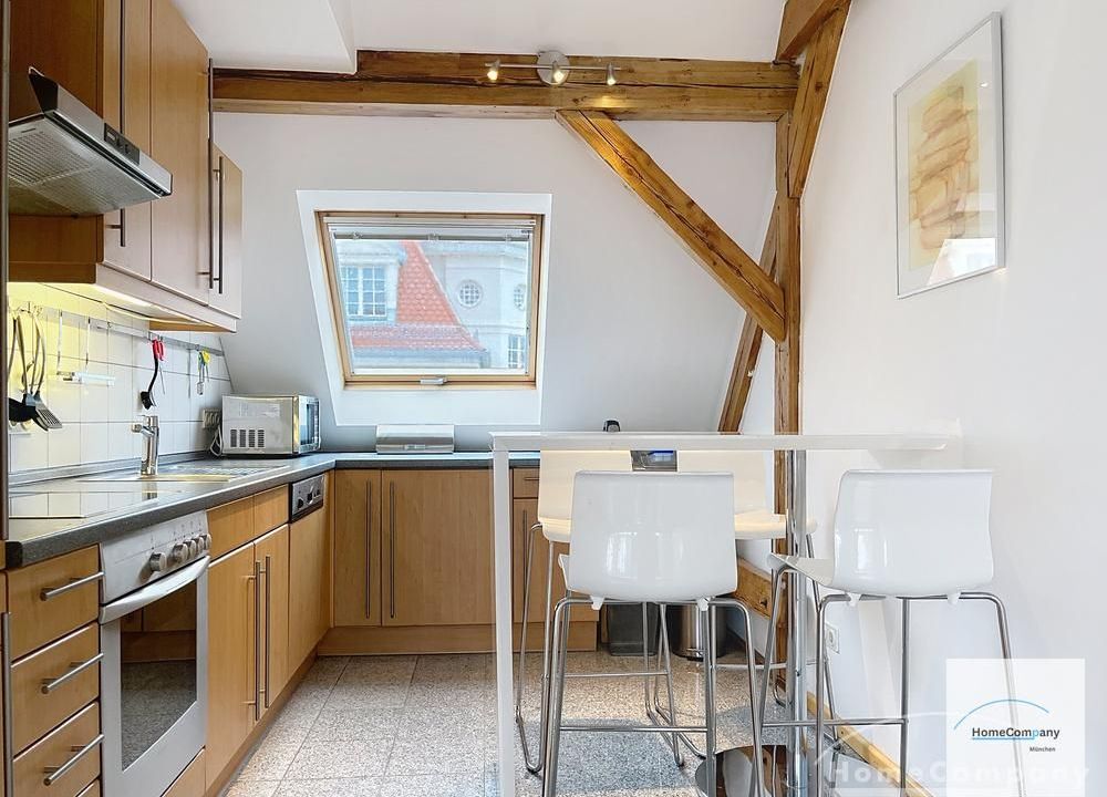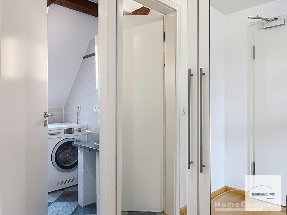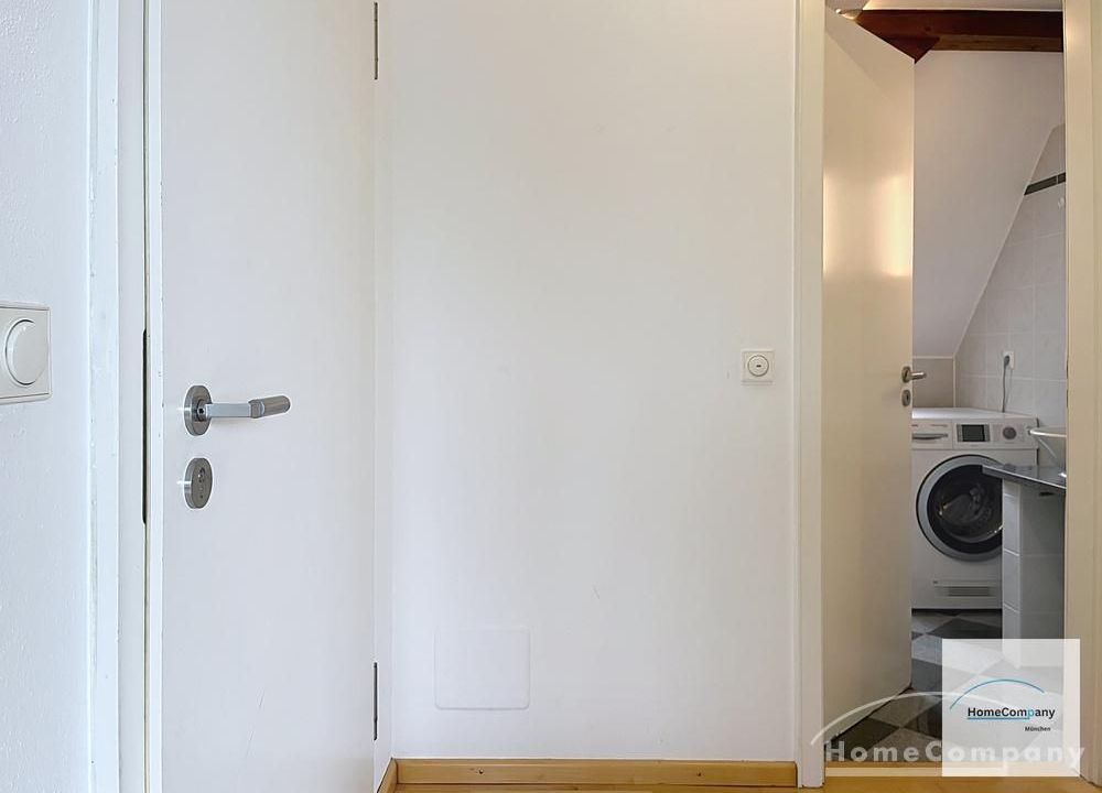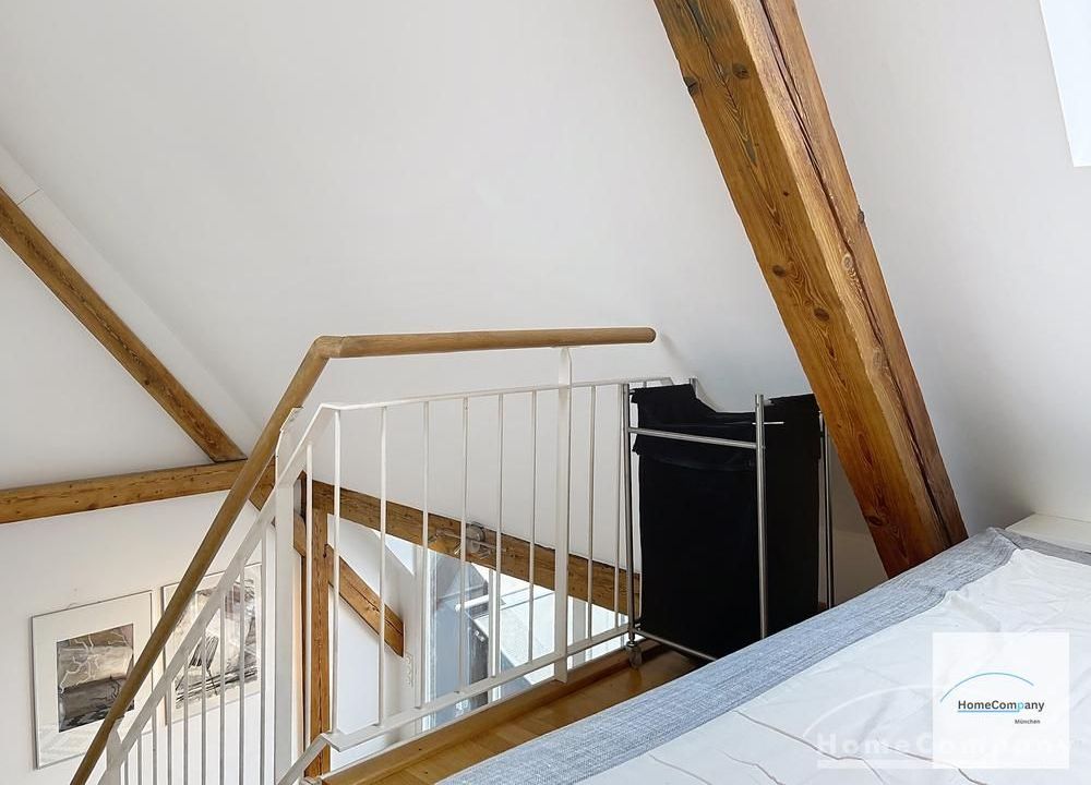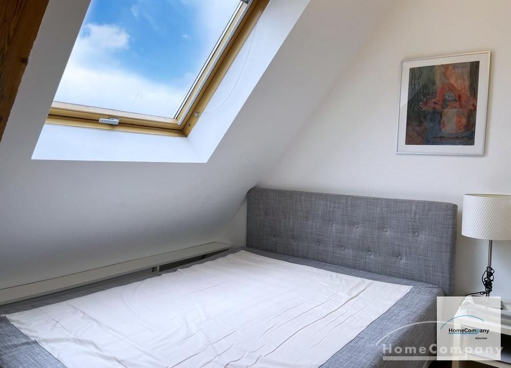 Helle, modern möblierte 1,5-Zimmer-Dachgeschoss-Maisonette-Wohnung mit Südbalkon in Schwabing. 5. OG. Im unteren Teil der Wohnung befinden sich der helle Wohnbereich mit Sofa und TV, das Badezimmer, sowie die offene Küche. Diese ist bestens ausgestattet mit allem, was man täglich benötigt, z.B. Mikrowelle, Spülmaschine. Essplatz für bis zu 4 Personen vorhanden. Badezimmer mit Badewanne und Wasch-Trockner-Kombination.