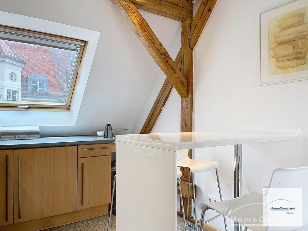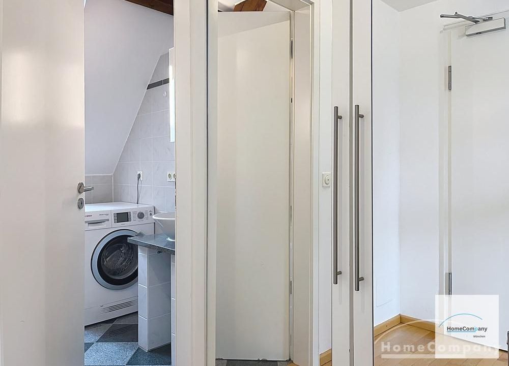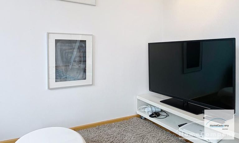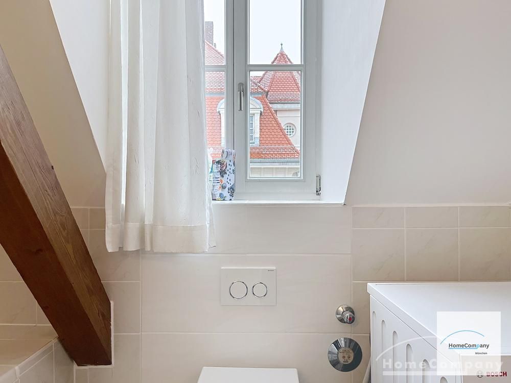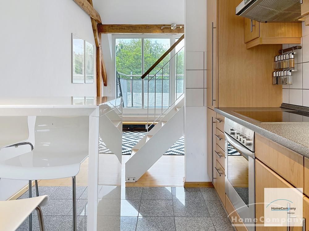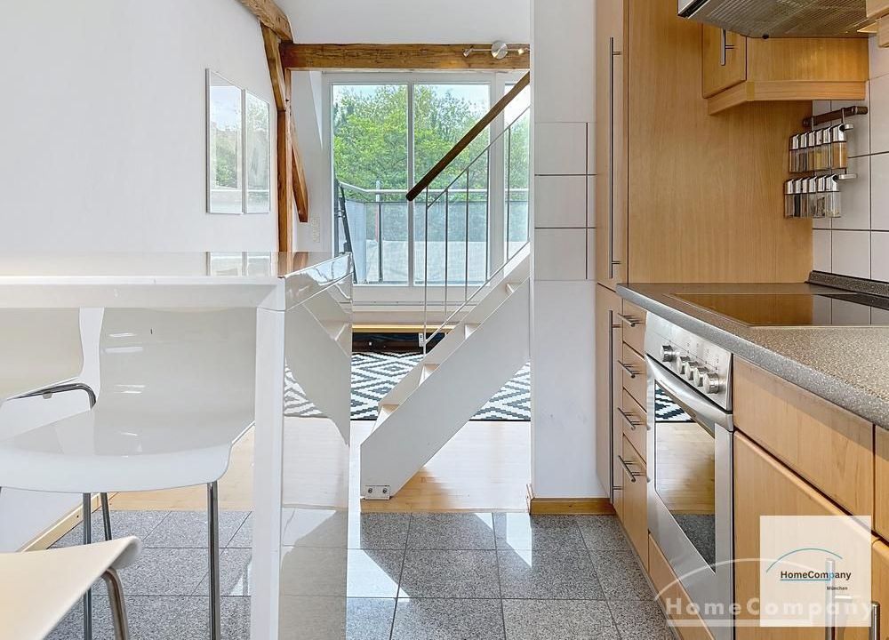 Helle, modern möblierte 1,5-Zimmer-Dachgeschoss-Maisonette-Wohnung mit Südbalkon in Schwabing. 5. OG. Im unteren Teil der Wohnung befinden sich der helle Wohnbereich mit Sofa und TV, das Badezimmer, sowie die offene Küche. Diese ist bestens ausgestattet mit allem, was man täglich benötigt, z.B. Mikrowelle, Spülmaschine. Essplatz für bis zu 4 Personen vorhanden. Badezimmer mit Badewanne und Wasch-Trockner-Kombination.