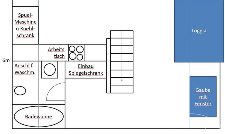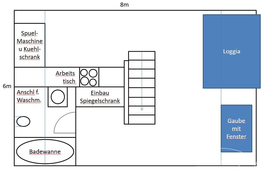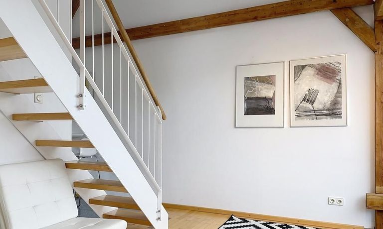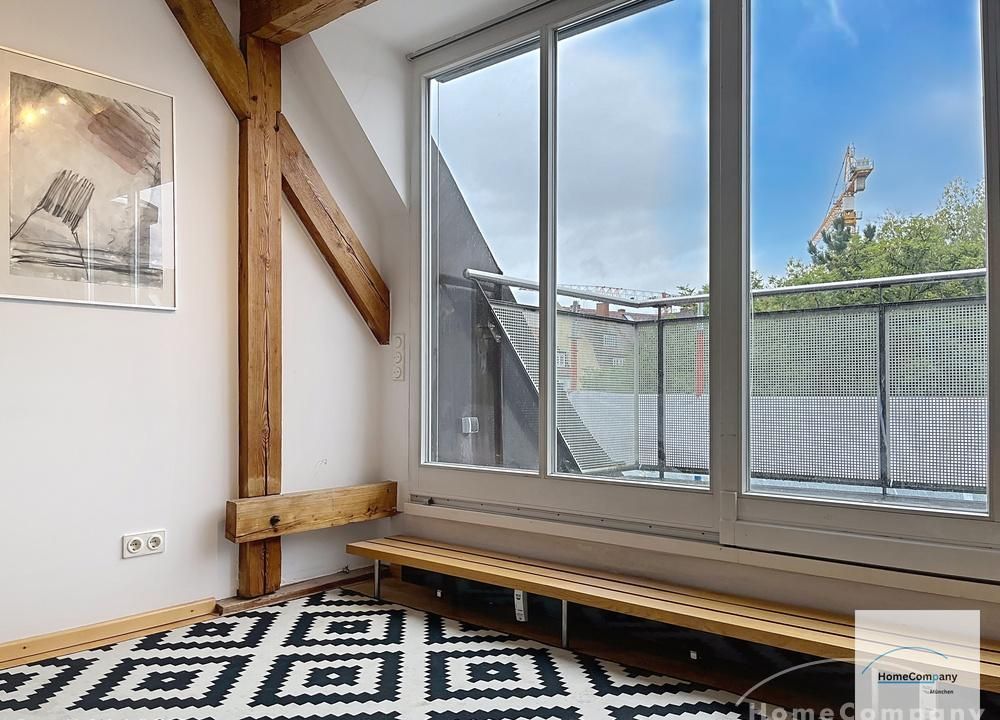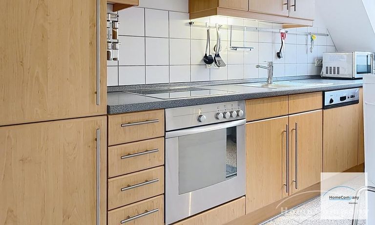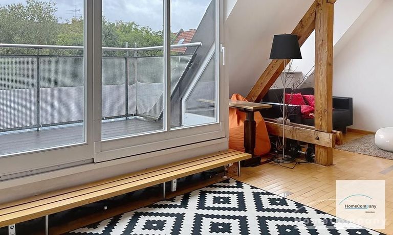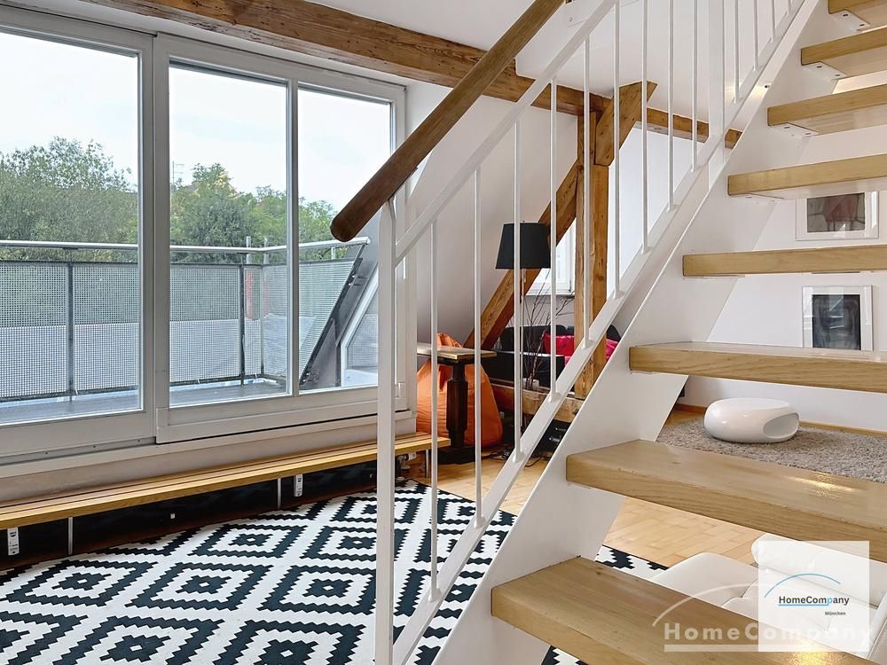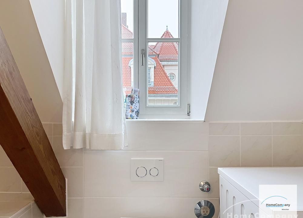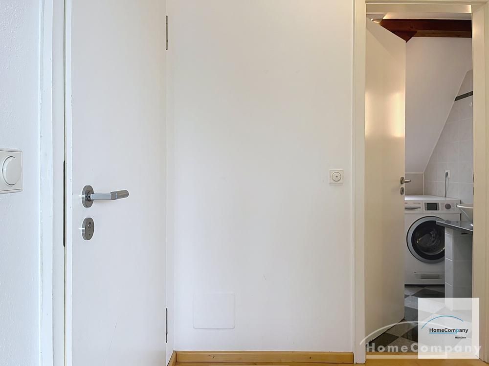 Helle, modern möblierte 1,5-Zimmer-Dachgeschoss-Maisonette-Wohnung mit Südbalkon in Schwabing. 5. OG. Im unteren Teil der Wohnung befinden sich der helle Wohnbereich mit Sofa und TV, das Badezimmer, sowie die offene Küche. Diese ist bestens ausgestattet mit allem, was man täglich benötigt, z.B. Mikrowelle, Spülmaschine. Essplatz für bis zu 4 Personen vorhanden. Badezimmer mit Badewanne und Wasch-Trockner-Kombination.