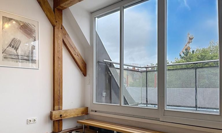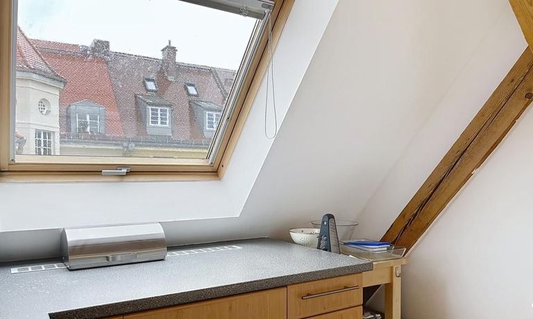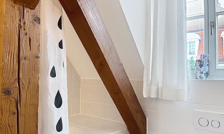 Die Wohnung versprüht durch die sichtbaren Dachbalken und den tollen Ausblick ihren ganz eigenen Charme. Abgesehen davon ist sie dank der Einbauschränke auch ein echtes Raumwunder, in dem sich alles verstauen lässt.