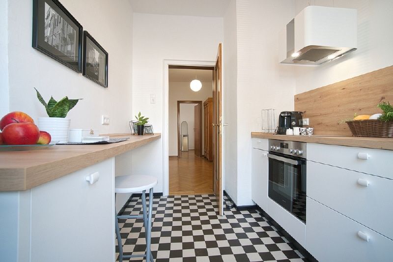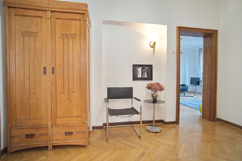 Die Wohnung wurde mit Liebe zum Detail, passend zum Stil des Hauses und komfortabel eingerichtet. Internetzugang kann ermöglicht werden. Schöne Eingangsdiele mit Jugendstil-Kleiderschrank. Wohnraum mit großem Leder-Ecksofa, TV-Gerät und ausziehbarem Glas-Esstisch. Die Küche ist mit einer neuen Einbauküche ausgestattet, inklusive Spülmaschine, Ceranherd mit schicker Dunstesse, Microwelle, Kühlschrank, Kaffeemaschine, Geschirr etc. und einer kleinen Bar mit Hocker. Das Schlafzimmer verfügt über eingebaute Kleiderschränke und ein 1,60 m breites Bett mit neuen Matratzen. Das helle Badezimmer mit Fenster hat eine Badewanne, Duschvorrichtung und ein Waschbecken mit Spiegelschrank und Unterschrank. Im Keller des Hauses gibt es einen Waschkeller mit einer Waschmaschine und einem Trockner für die Wohnung, weiterhin gibt es Platz, um Wäsche aufzuhängen.