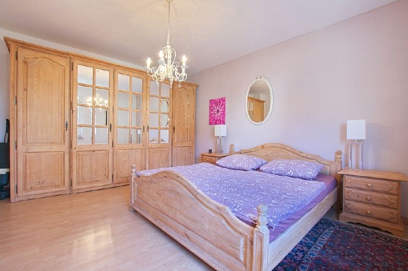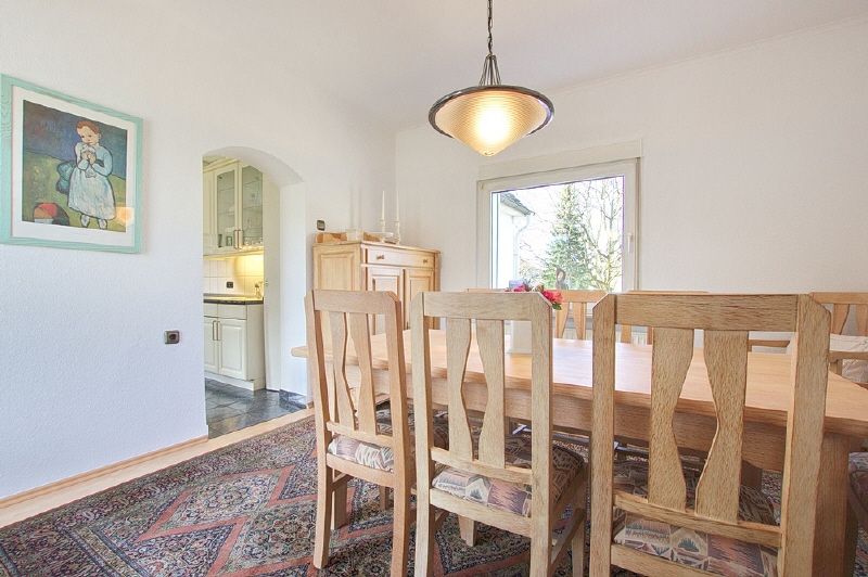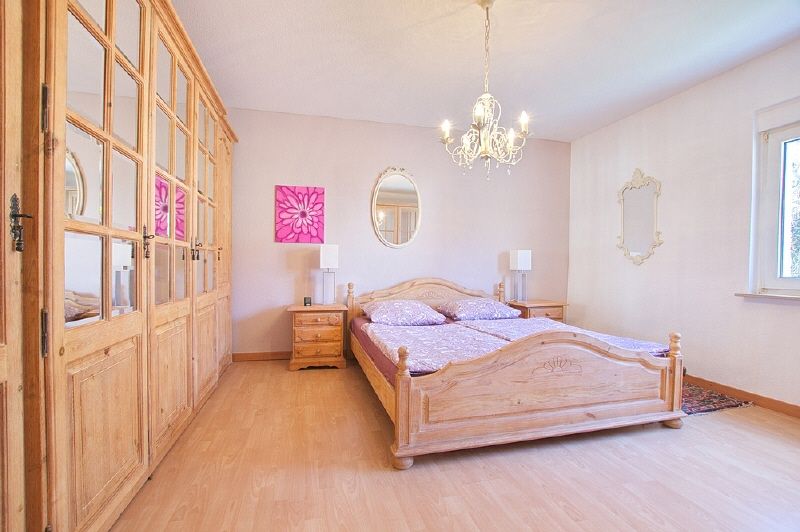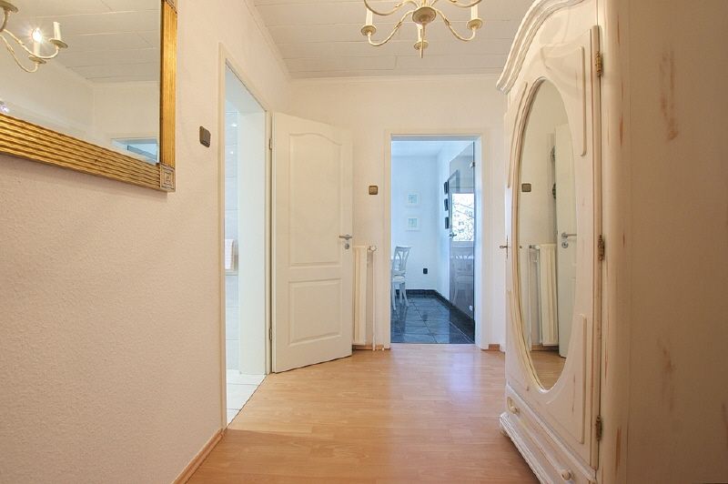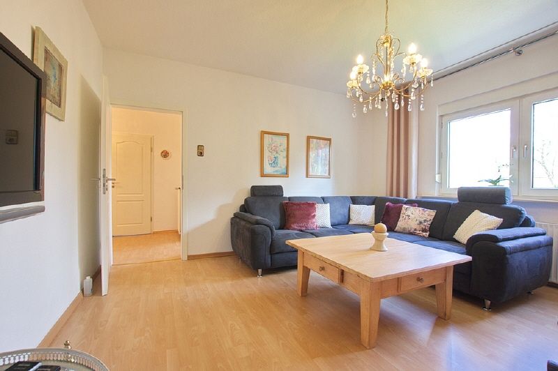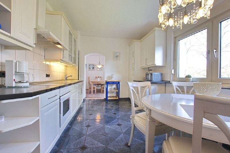Modern-gemütliche Einrichtung, vollständige Ausstattung inklusive Geschirr, Bettzeug und Wäsche. Die Wohnküche bietet eine Einbauküche inklusive Spülmaschine, Ceranherd mit Dunstabzug, Microwelle, Kühlschrank und Gefrierfach sowie einen Esstisch für bis zu vier Personen. Im anschließenden Ess- bzw. Arbeitszimmer gibt es einen weiteren, großen Tisch mit sechs Stühlen, hier befindet sich der Zugang zum Balkon mit Blick in den Garten. Das Schlafzimmer ist mit einem 1,80 Meter breiten Doppelbett und einem großen Kleiderschrank eingerichtet. Das hell geflieste Badezimmer hat eine Eckwanne mit Duschvorrichtung, Handtuchheizung, zwei Fenster, einen großen Waschtisch mit viel Stauraum und ein wandhängendes WC. Das Wohnzimmer ist mit einem großen Ecksofa, Schrank und Smart-TV eingerichtet. Internetzugang (100 Mbit-Anschluss) kann zur Verfügung gestellt werden. Waschmaschine und Trockner stehen im Keller des Hauses zur Verfügung.