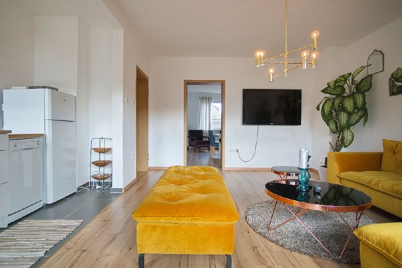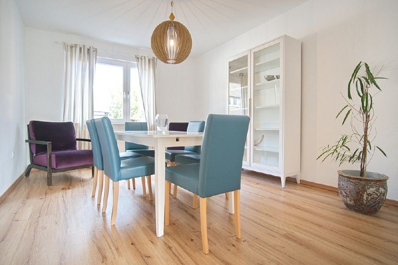 Großes Wohnzimmer mit kuscheligem, hochwertigem Ecksofa mit zusätzlicher Bank, großer TV-Bildschirm, Ausgang zum Balkon (Südwestlage). Die Küche ist offen integriert und mit Kühl-Gefrier-Kombination, Spülmaschine, Induktions-Kochfeld, Backofen, Geschirr und Töpfen ausgestattet (neuwertig von 2018). Im separaten Esszimmer steht ein großer, ausziehbarer Tisch mit 6 Stühlen und ein Vitrinenschrank bereit. Das Schlafzimmer ist mit einem Doppelbett und Schminktisch eingerichtet, im 2. Schlafzimmer steht ein großer Kleiderschrank. Eine Matratze/ein Bett kann zur Verfügung gestellt werden. Zur Wohnung gehört ein hell gefliestes Duschbad (Walk-In) mit Fenster. Die Waschmaschine steht im Keller, hier kann auch Wäsche aufgehängt werden.