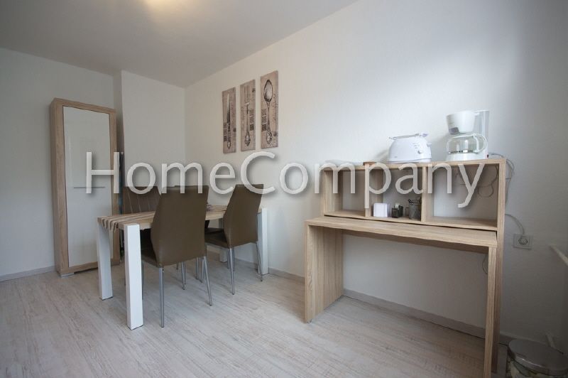 Moderne und komplette Einrichtung, heller Laminatboden, Internetzugang vorhanden. Im kombinierten Wohnschlafraum stehen ein Schrankbett mit Kaltschaum-Matratze, ein Sofa mit Schlaffunktion und eine Wohnwand mit TV-Gerät (Flatscreen) und Kleiderschrank bereit. Die separate Wohnküche bietet eine komplette Küchenzeile inklusive Waschmaschine, Kühlschrank mit Eisfach, Doppelkochfeld, Microwelle, Air-Fryer sowie einen Wäschetrockner (Kondens-System). Dort befindet sich auch ein Essplatz für bis zu vier Personen. Eine Koch- und Geschirrausstattung, Kaffeemaschine etc. ist vorhanden. Weiterhin steht ein Schreibtisch zur Verfügung.