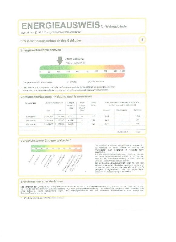 Angaben zum Energieausweis: Baujahr des Hauses: 1954, Anlagentechnik 1999, Energieverbrauchsausweis, Wert: 107,2 kWh/(m²a); Energieträger: Fernwärme.