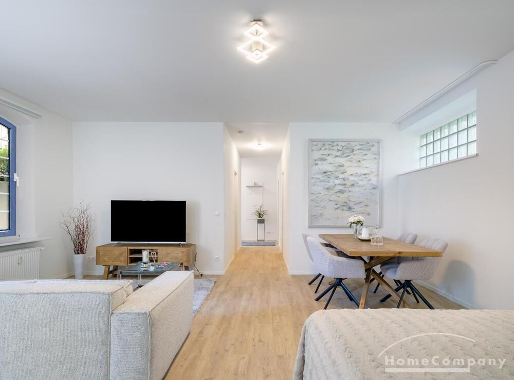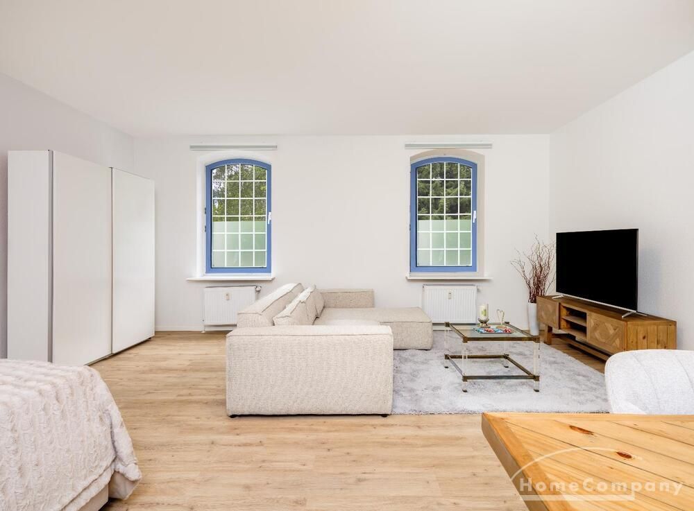 Die moderne und stilvolle Einrichtung umfasst hochwertige Möbel, darunter ein komfortables Boxspringbett im Hotelstandard (1,60 × 2,00 m). Der kombinierte Wohn- und Schlafbereich wirkt großzügig, einladend und bietet viel Freiraum zum Entspannen.