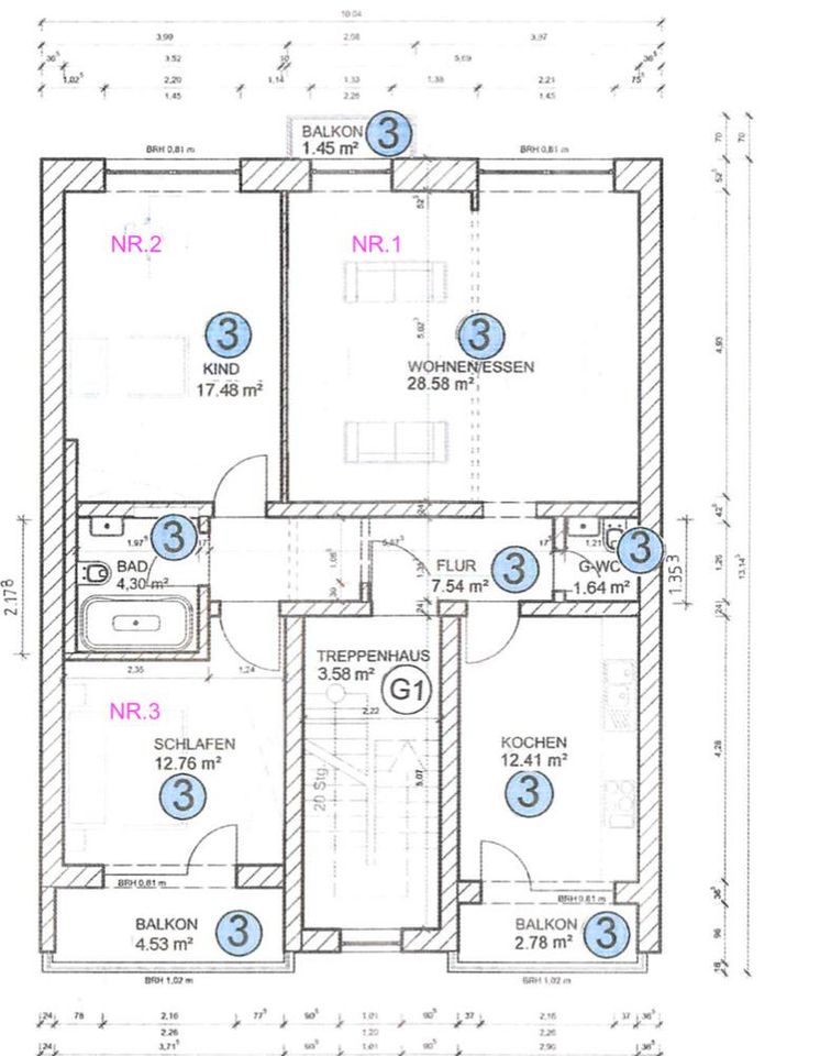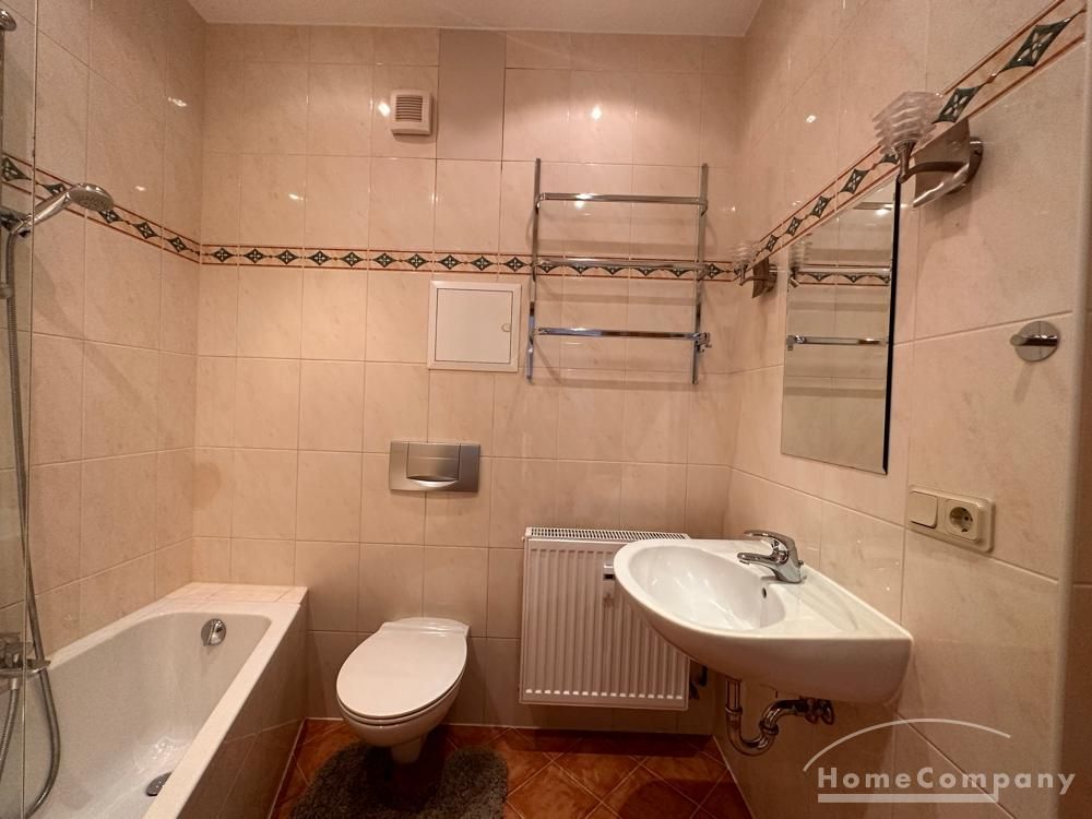 Die Wohnung verfügt über ein Bad mit Badewanne, Waschbecken und WC und ein Gäste WC.