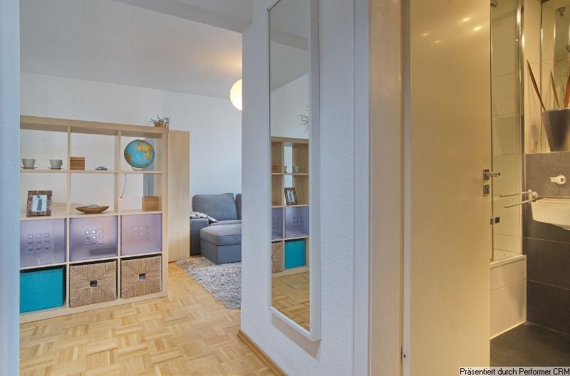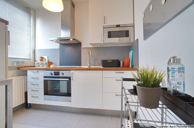 Wohnschlafraum mit Parkettboden, Internetzugang und TV Magenta L sind in der Miete enthalten. Wohnbereich mit Sofa und TV, das Bett ist durch einen Schrank und ein Regal räumlich abgeteilt. Am Fenster gibt es einen Schreibtisch mit Stuhl und direkten Zugan zum Balkon mit Tisch und Stühlen. Die komplett ausgestattete Küche ist sehr modern, mit Kühlschrank und Eisfach, Kochfeld mit Dunstabzug, Backofen, Microwellen-/Dampfgargerät, Toaster, Geschirr usw. Zur Wohnung gehört ein schönes Bad mit Wanne und Duschvorrichtung mit Glastrennwand, Handtuchheizung und großem Spiegel.