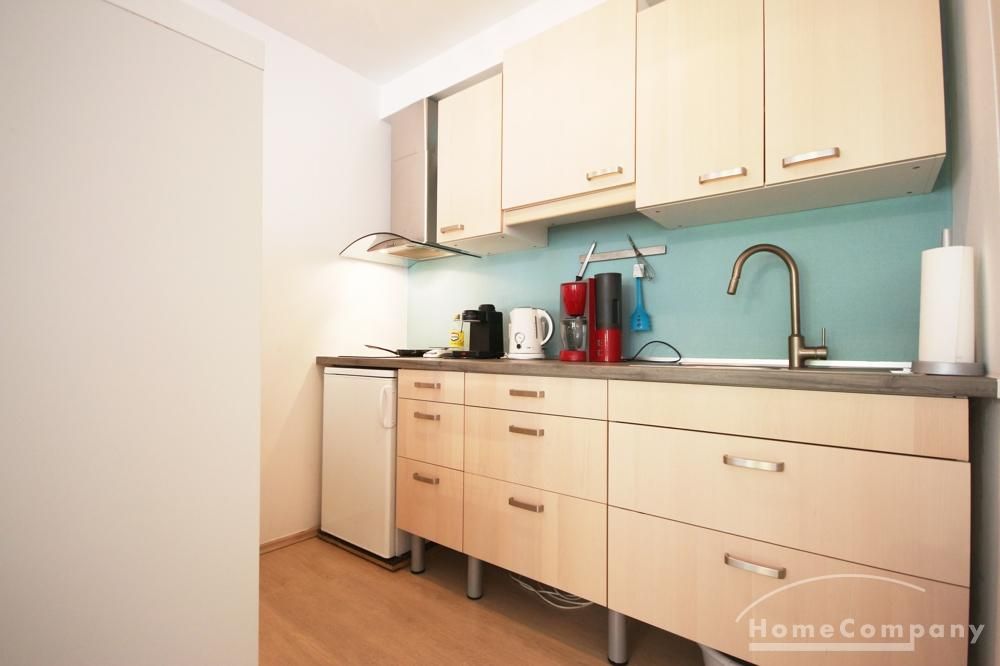 + Einbauküche mit Kühlschrank inklusive Gefrierfach, Kochfeld, Kaffeemaschine, Geschirr, Besteck, Gläser,