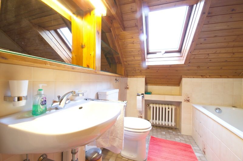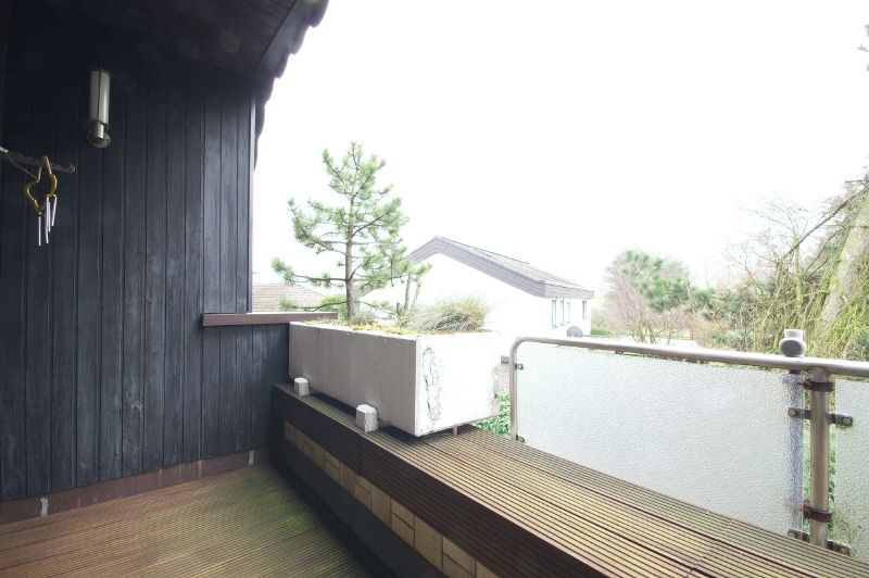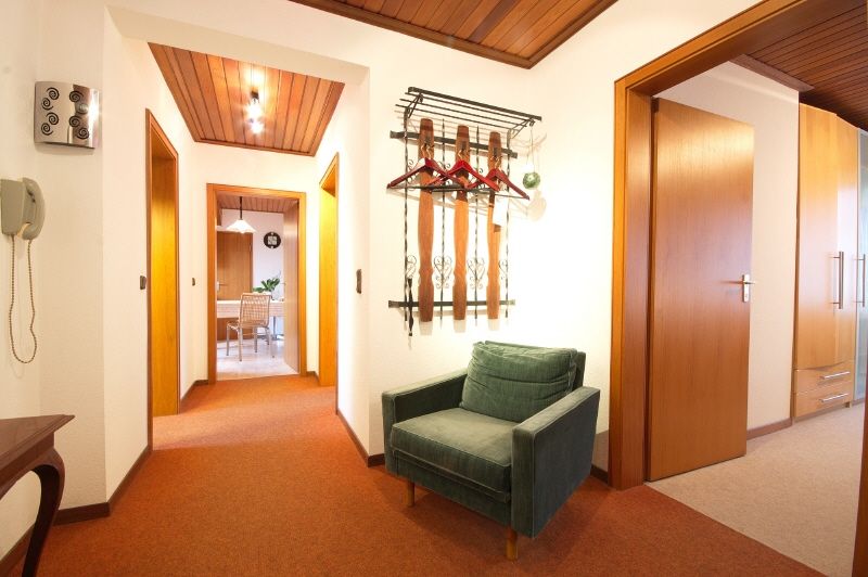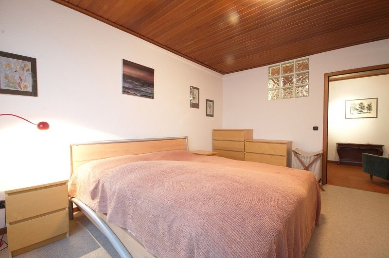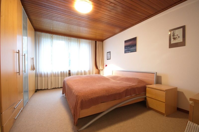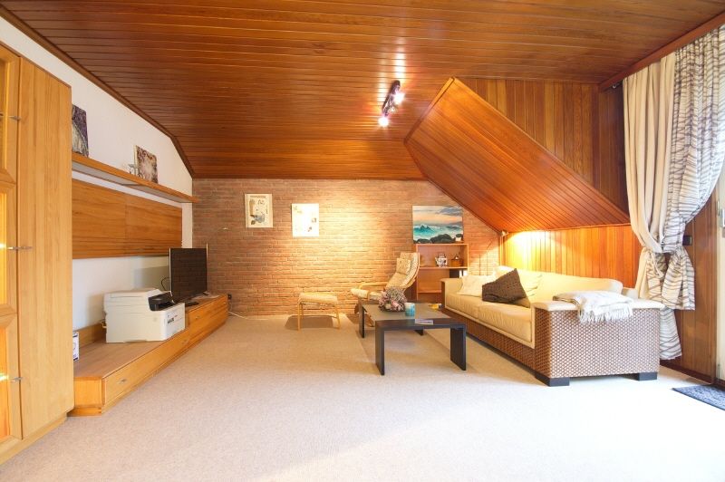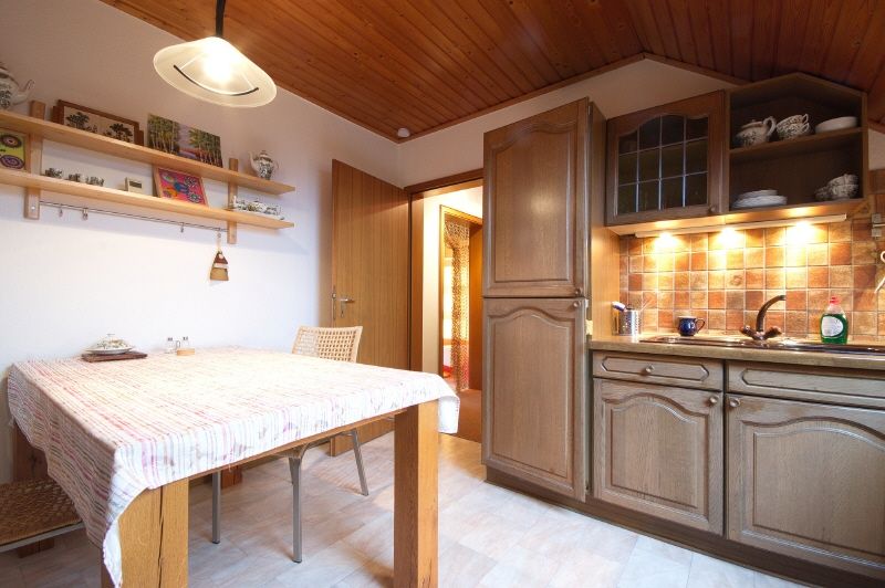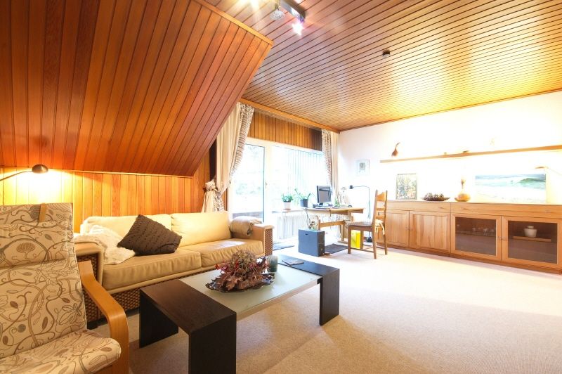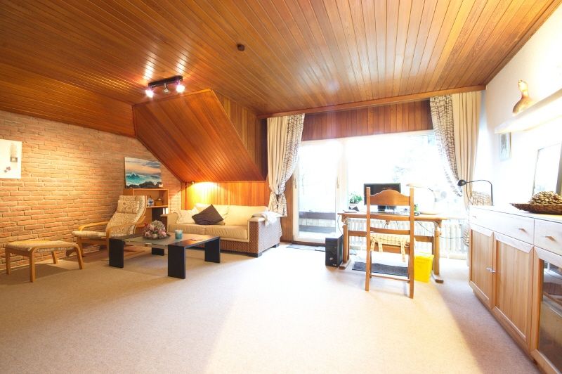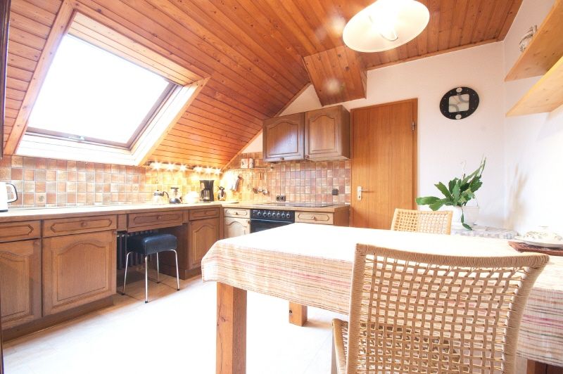 Geräumiges Wohnzimmer mit Ausgang zum Südbalkon, sehr schöner Blick zu den umliegenden Feldern. Sofa, Sat-TV, Relaxsessel, Echtholz-Mobiliar. Schlafzimmer mit Doppelbett und großem Kleiderschrank. Wohnküche mit Einbauküche, kleiner Spülmaschine und Microwelle, Esstisch, zwei Stühle. Anschließender Abstellraum unter der Schräge. Hell gefliestes Bad mit Wanne und Dusche sowie einem Fenster. Internetzugang verfügbar. Doppelverglaste Fenster, wärmeisolierte Wände und Decken. Eine Miele Waschmaschine steht im Untergeschoss des Hauses zur Mitbenutzung bereit.