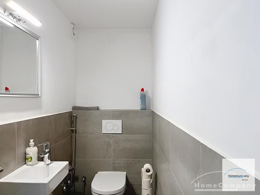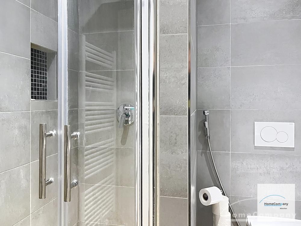 Das moderne Badezimmer verfügt über bodentiefe Dusche. Zusätzlich gibt es ein Gäste-WC.