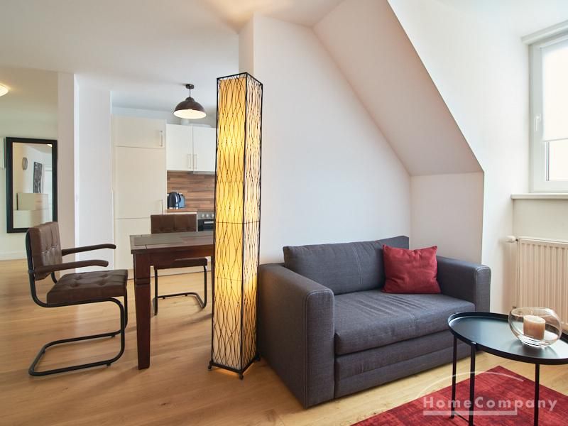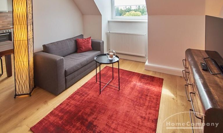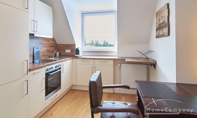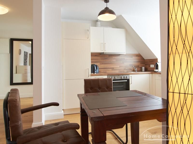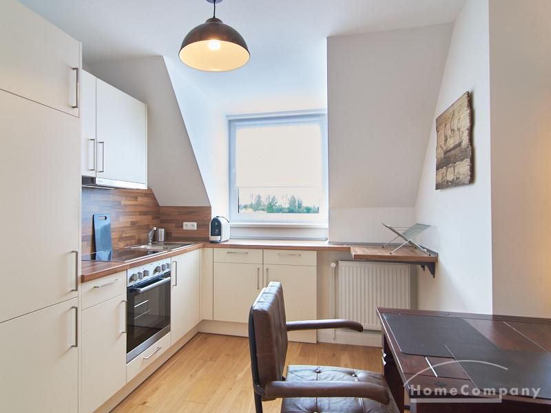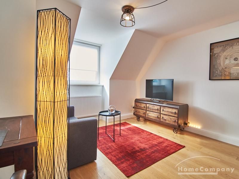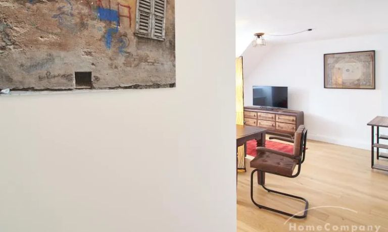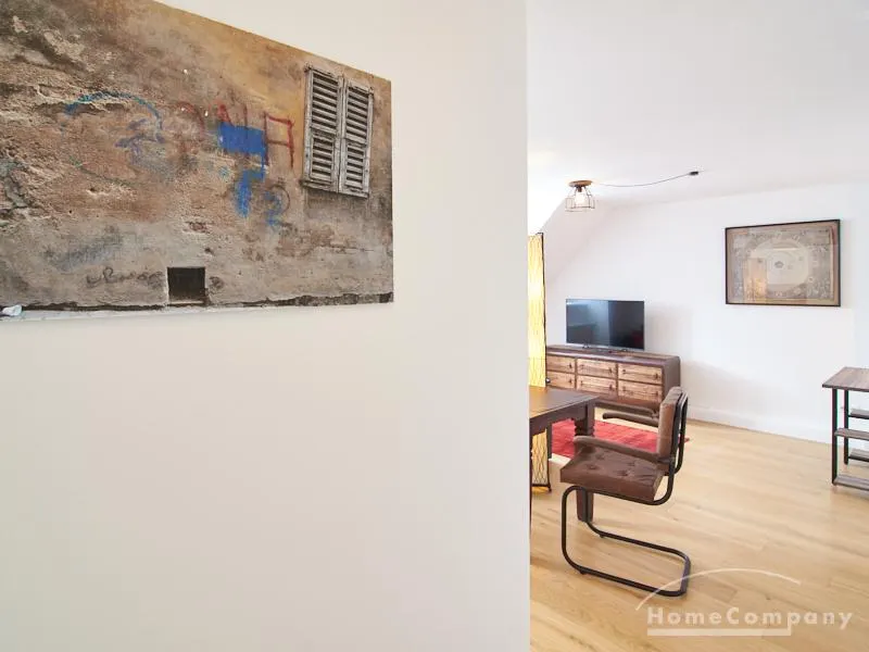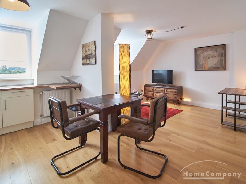 Die Wohnung besticht durch Ihre schönen Dachschrägen mit ansprechend gestalteten Gauben für die Fenster. Die moderne Möblierung mit industrial Elementen unterstützt die großzügige Raumwirkung, besondere Akzente lassen sich über ein Smart-Home-Lichtsystem setzen.