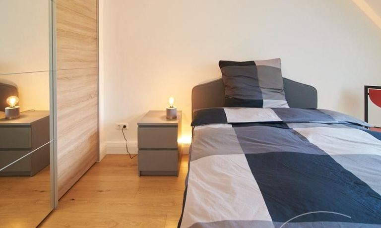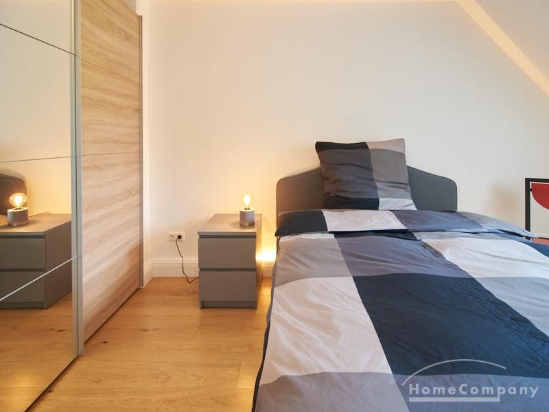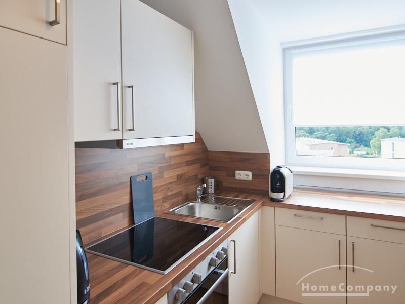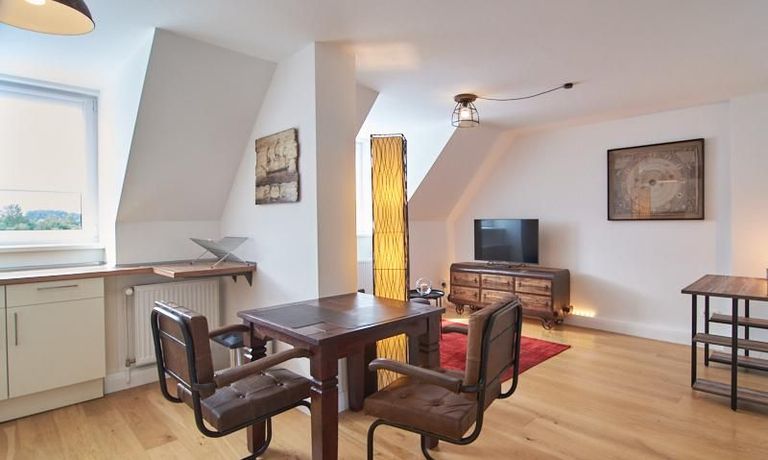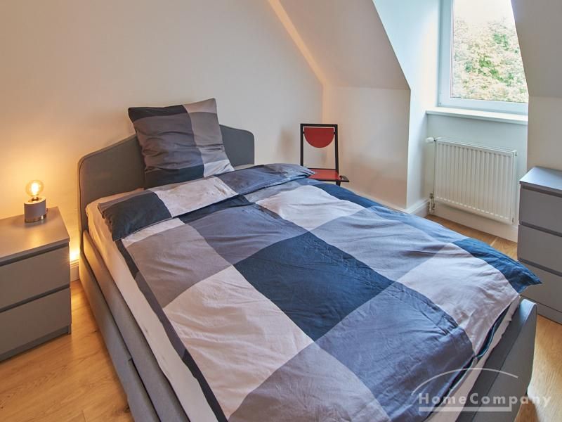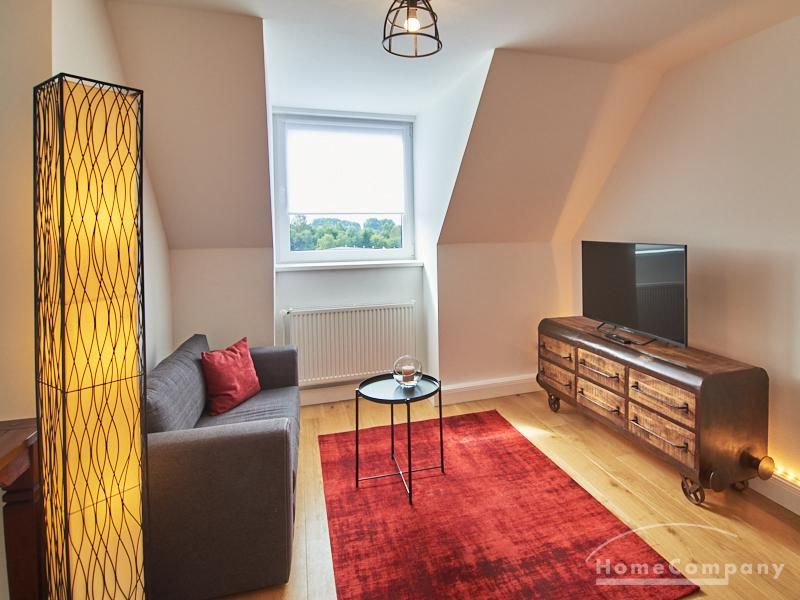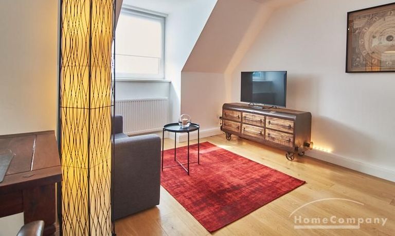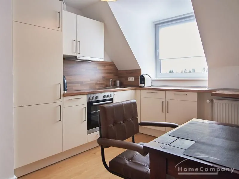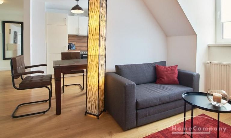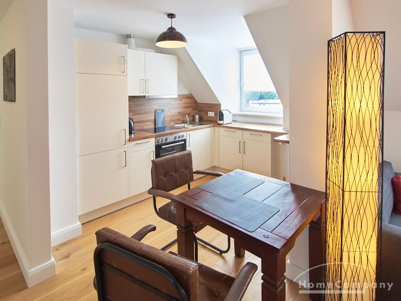 Die Wohnung besticht durch Ihre schönen Dachschrägen mit ansprechend gestalteten Gauben für die Fenster. Die moderne Möblierung mit industrial Elementen unterstützt die großzügige Raumwirkung, besondere Akzente lassen sich über ein Smart-Home-Lichtsystem setzen.