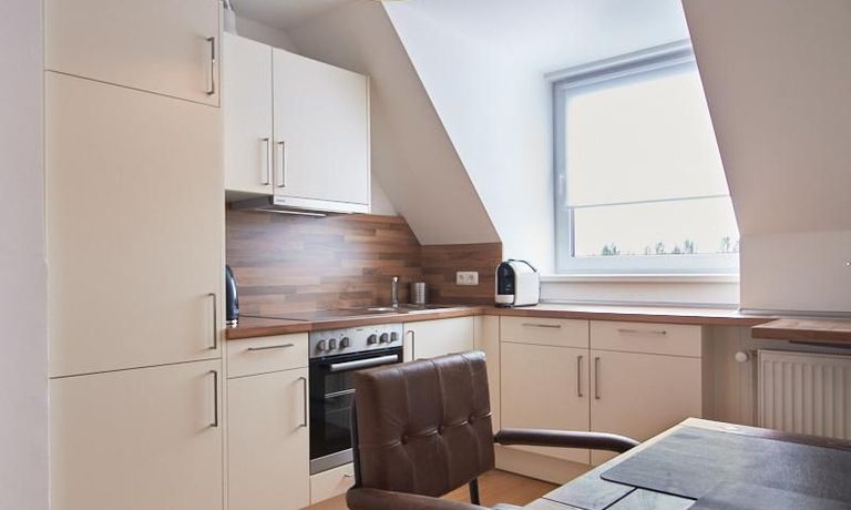 Die Küche ist zum Wohnraum hin offen und nur durch einen Mauervorsprung separiert. Ein Esstisch und ein gemütlicher, mit smart TV ausgestatteter Sofabereich stehen zur Verfügung. Das Schlafzimmer ist mit einem 1,40 breiten Bett ausgestattet. Küche und Bad haben einen guten, modernen Standard.