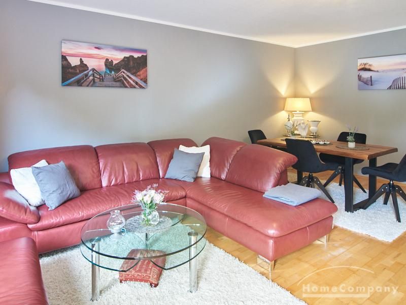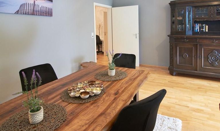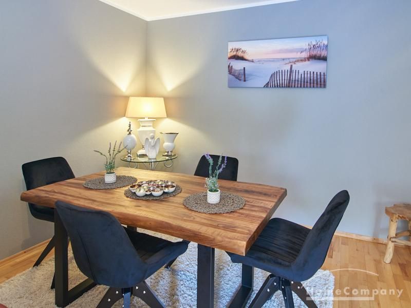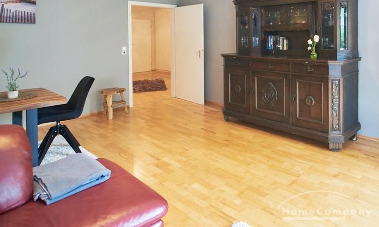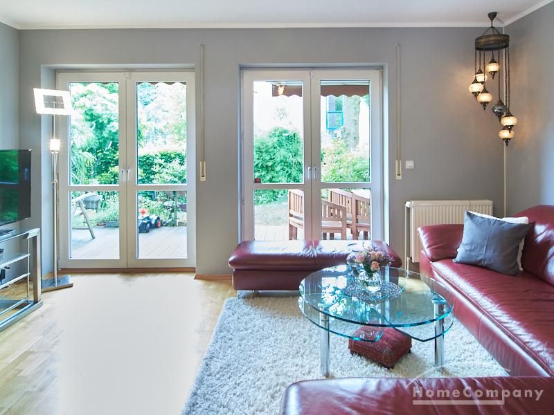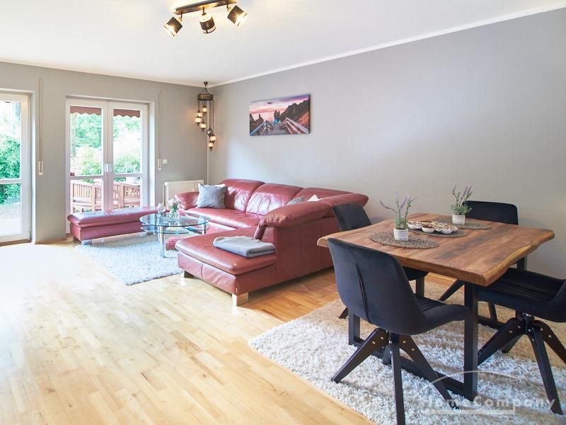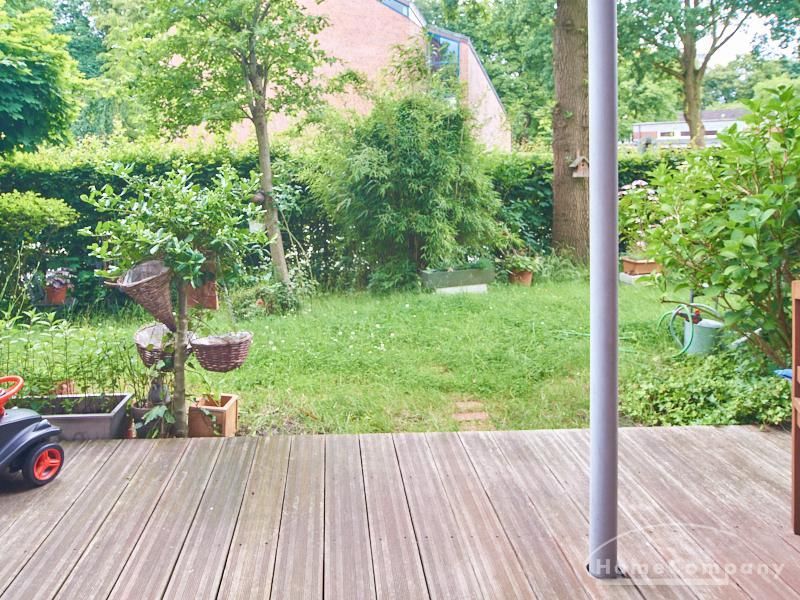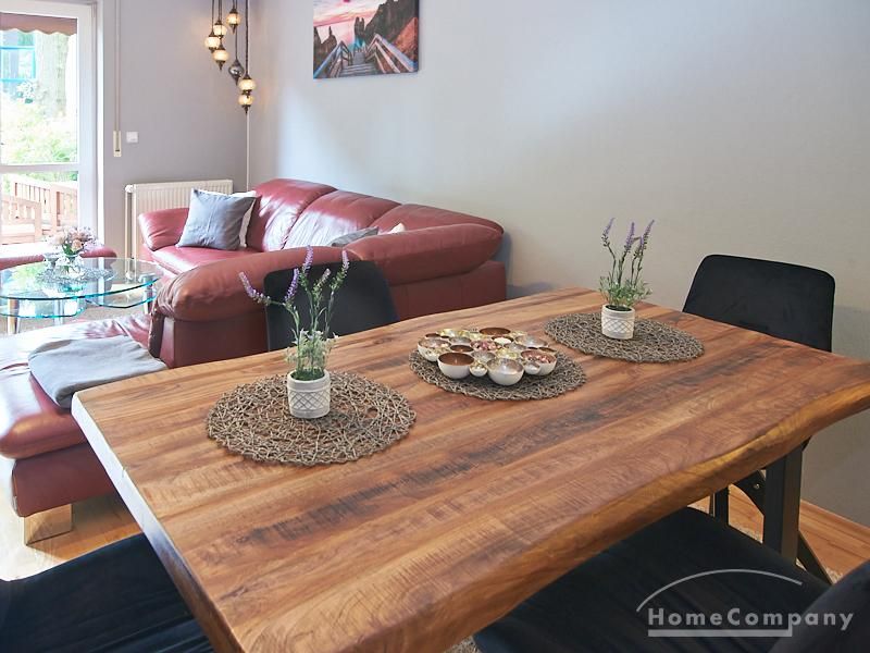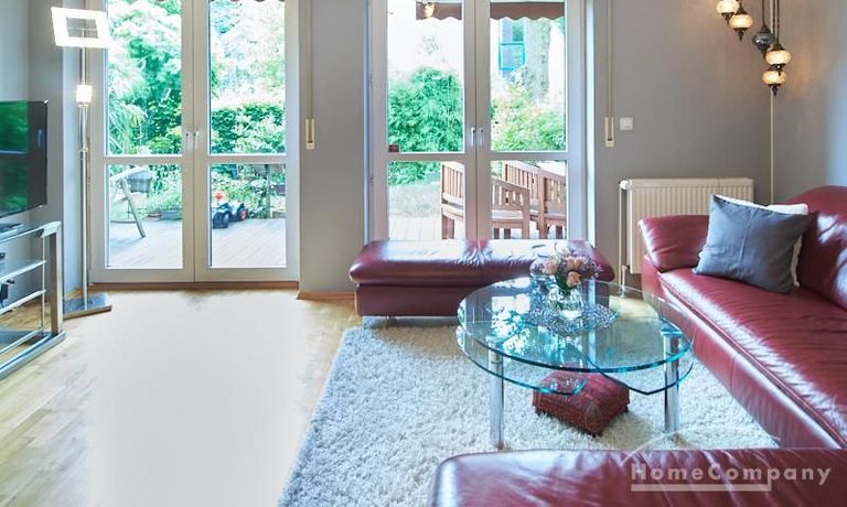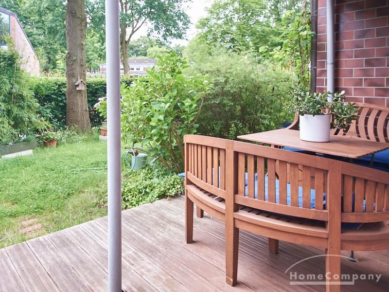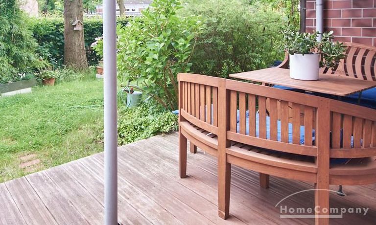 Die Wohnung ist in einer ruhigen Wohnstraße gelegen. Das Wohnzimmer ist zum grünen Gemeinschaftsgarten der Wohnanlage hin orientiert und verfügt über einen komfortablen Sofabereich und einen Esstisch mit vier Stühlen. Auf der vorgelagerten, mit Holzplanken ausgestatteten, Terrasse stehen zwei runde Sitzbänke und ein Tisch zur Verfügung.