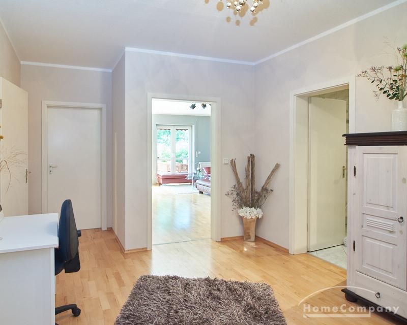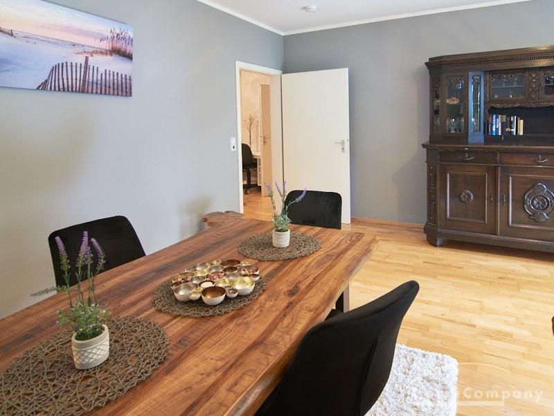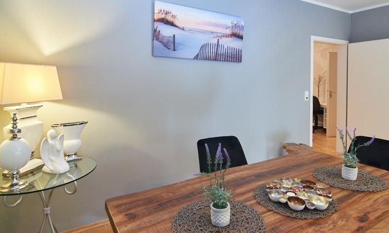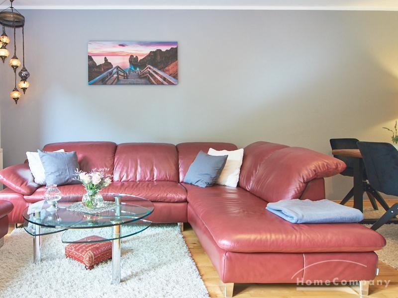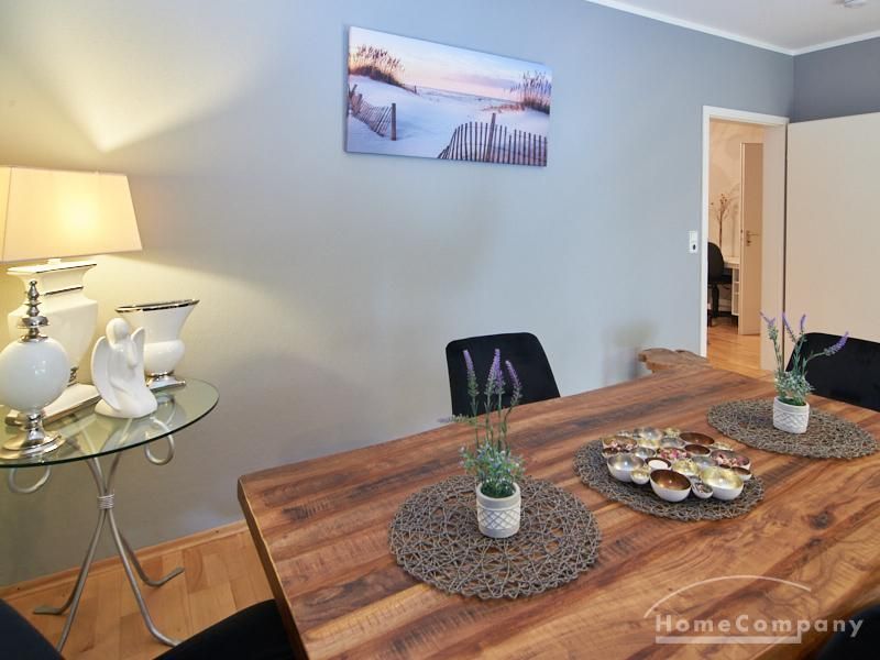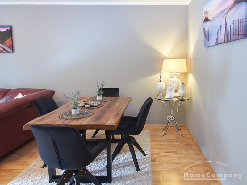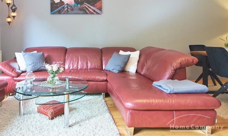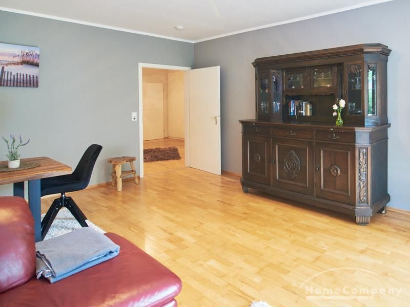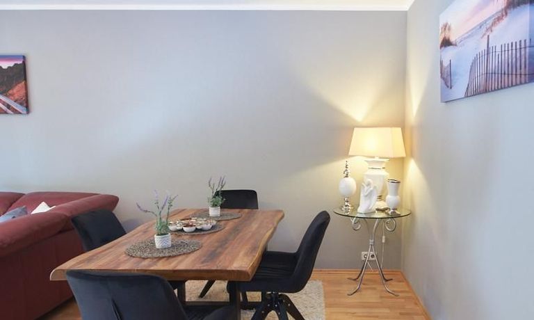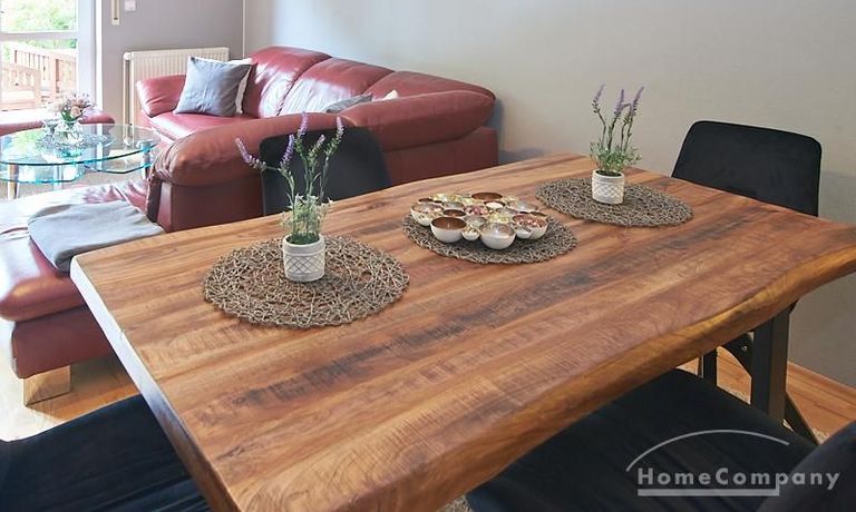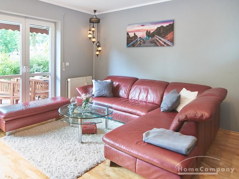 Die Wohnung ist in einer ruhigen Wohnstraße gelegen. Das Wohnzimmer ist zum grünen Gemeinschaftsgarten der Wohnanlage hin orientiert und verfügt über einen komfortablen Sofabereich und einen Esstisch mit vier Stühlen. Auf der vorgelagerten, mit Holzplanken ausgestatteten, Terrasse stehen zwei runde Sitzbänke und ein Tisch zur Verfügung.