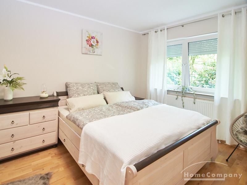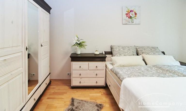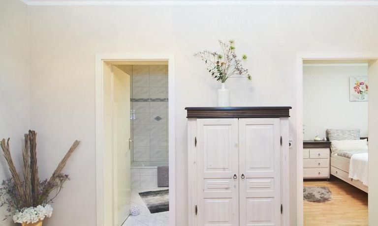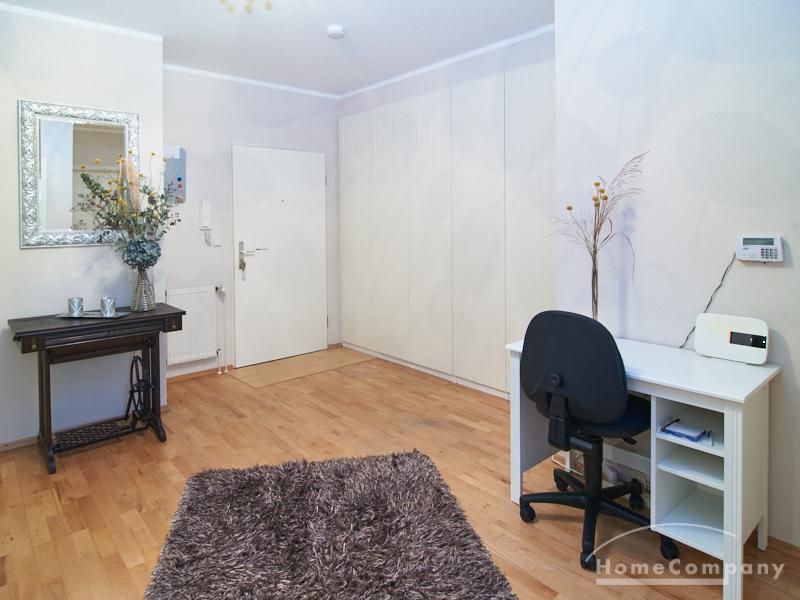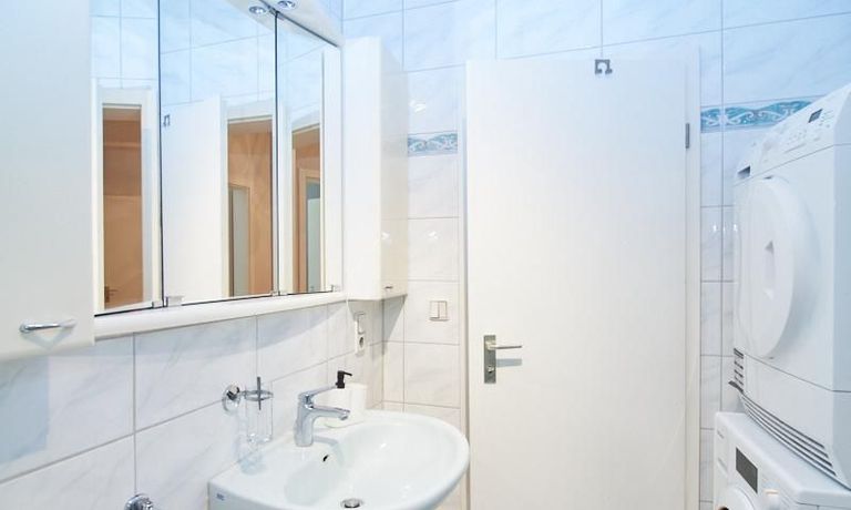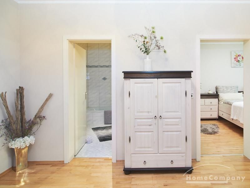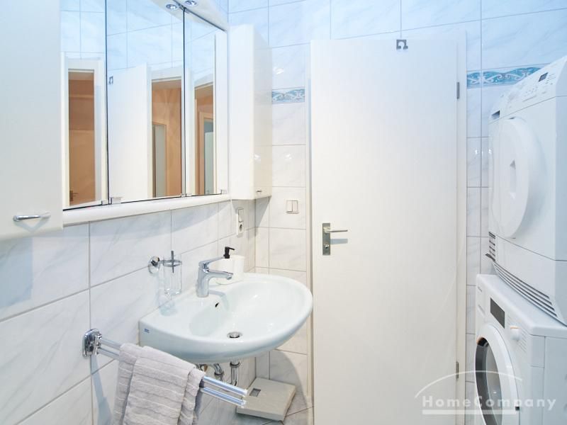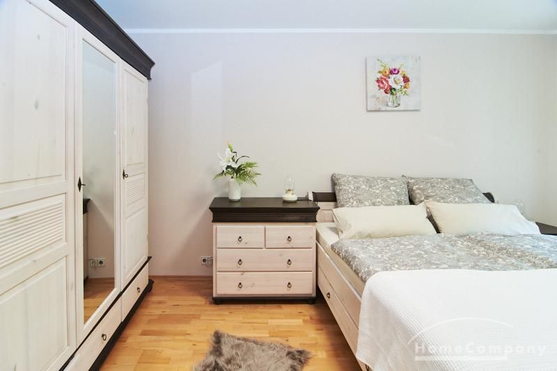 Das Schlafzimmer ist mit einem Doppelbett und reichlich Schrankfläche ausgestattet. Im großzügigen Eingangsbereich befindet sich ein Platz für das Homeoffice. Zusätzlich zum, mit einer Badewanne ausgestatteten Badezimmer ist ein separates Gäste WC mit einer Dusche vorhanden. Im Badezimmer befindet sich eine Miele Waschmaschine und ein separater Trockner.