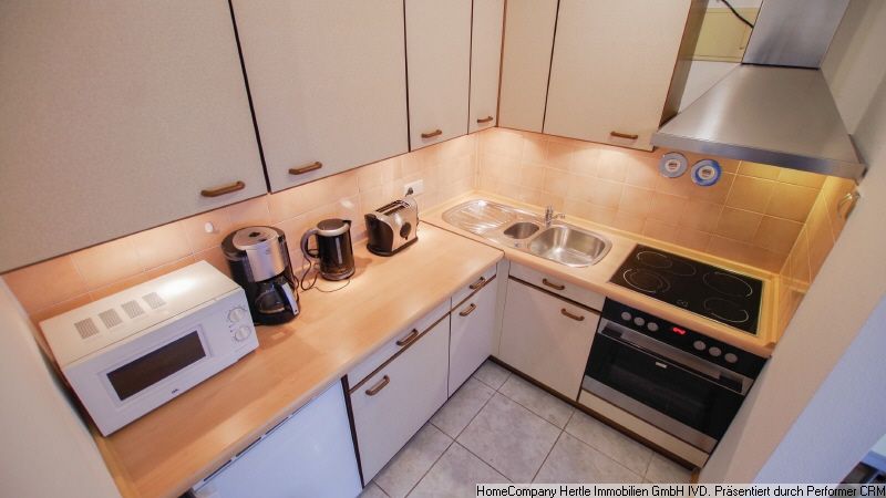 Aufgeteilt in großzügigen Wohn-/Schlafbereich mit abgetrennter Einbauküche,