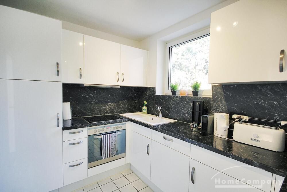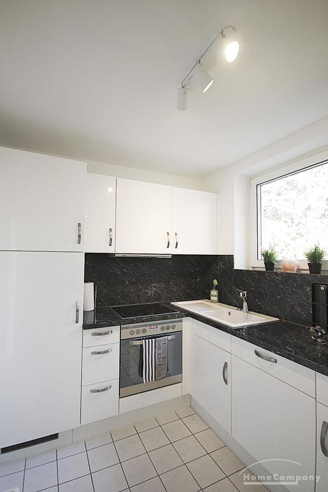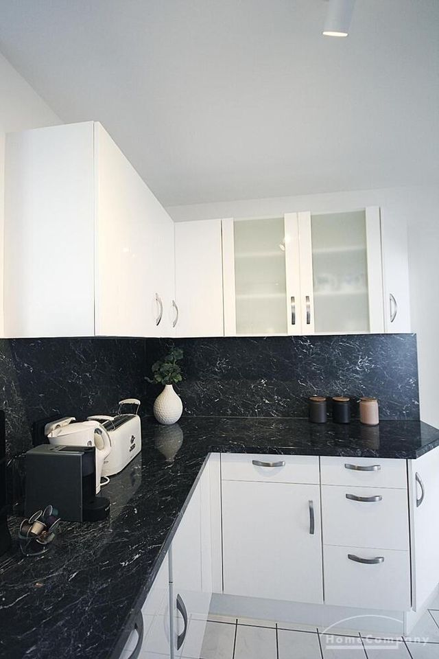 Vom Wohnbereich aus über den Flur befindet sich links als nächstes die elegant in schwarz weiß gehaltene Küche. Mit qualitativen Elektrogeräten, einer Spülmaschine lädt diese zum gemeinsamen Kochen ein.