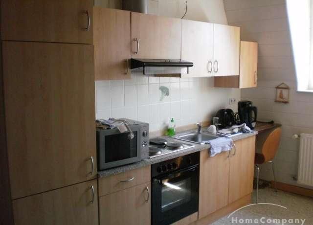 Einbauküche mit Ceranherd mit Backofen, Mikrowelle, großer Esstisch, 6 Stühlen.
