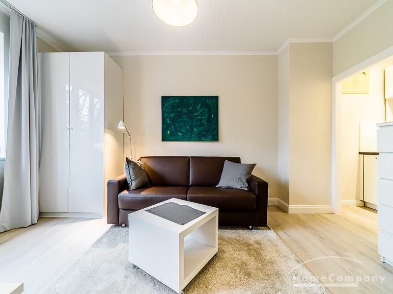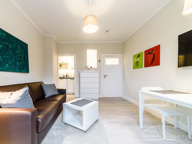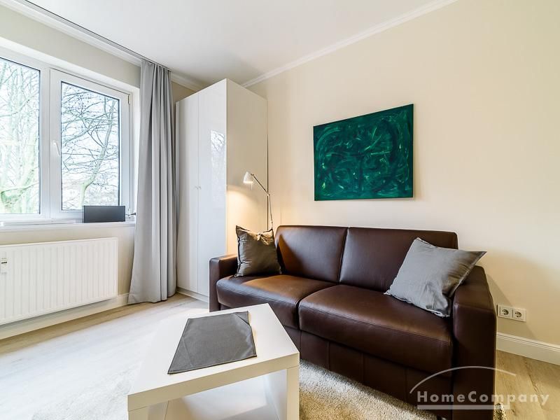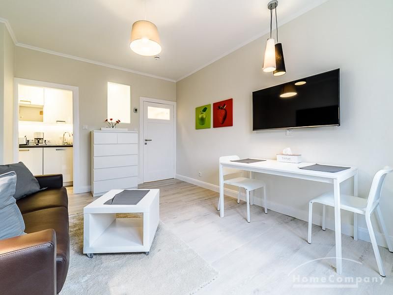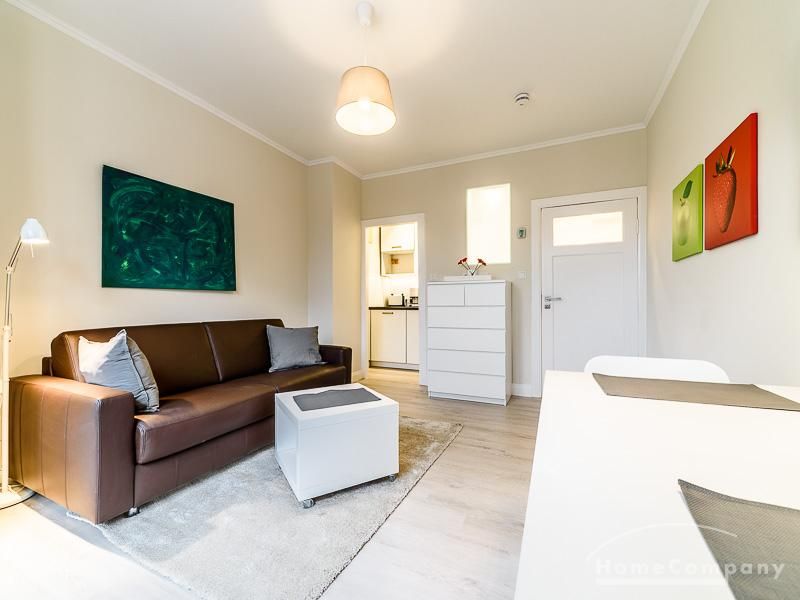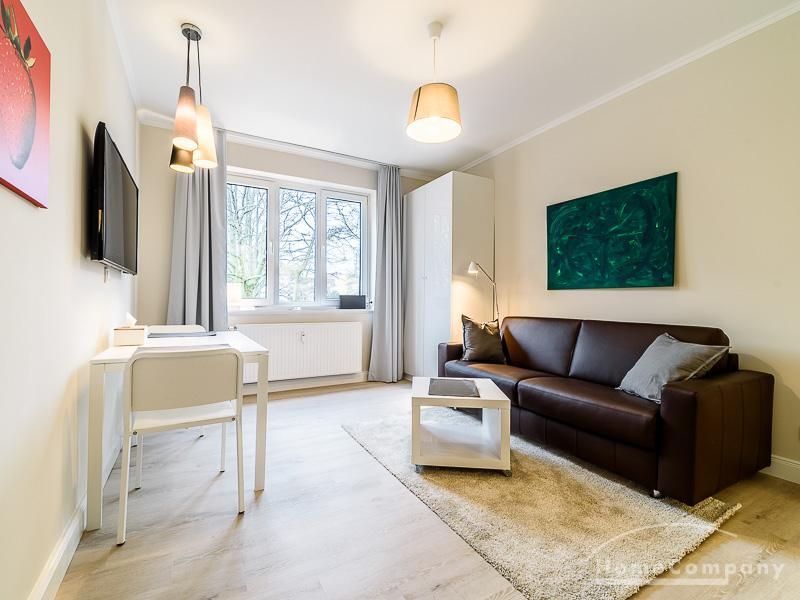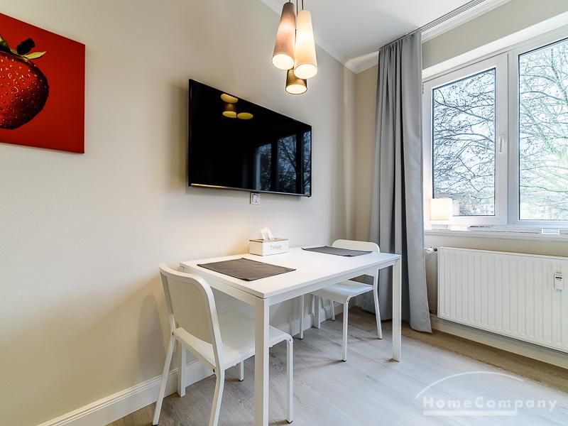 Im Apartment ist ein ansprechender und pflegeleichter Designboden verlegt. Im Wohn-/Schlafraum steht ein hochwertiges, mit Matratze und Lattenrost ausgestattetes Bettsofa zur Verfügung. Eine Fototapete mit einem Birkenwald gibt eine gute Raumwirkung. Weiterhin biete ein kleiner Tisch mit zwei Stühlen einen schönen Essplatz, der auch als Schreibtisch genutzt werden kann. In die Wand zwischen Bad und Küche ist im oberen Bereich ein Lichtfeld integriert. Insgesamt zeichnet sich das Apartment auch durch einige nette durchdachte Details, wie z.B. ein integriertes Badezimmerradio aus. Im Wohnzimmer steht ein 48 “ TV ebenso wie ein bluetooth / CD Player zur Verfügung. Die Wohnung ist gegenüber eines Parks gelegen. KfZ Stellplätze sind im Straßenraum vorhanden.