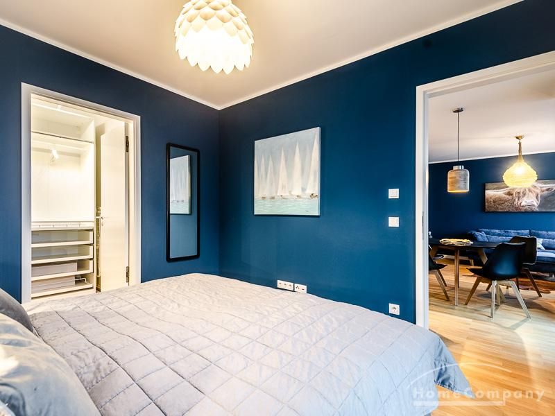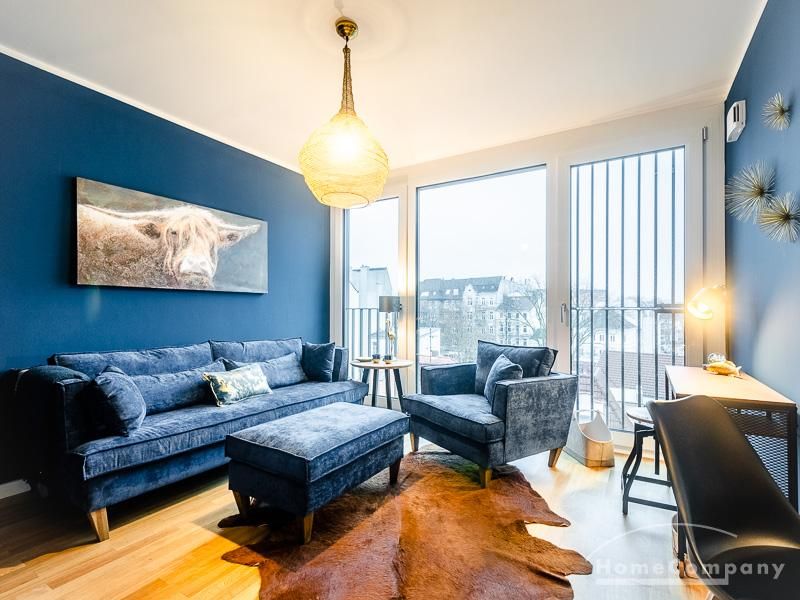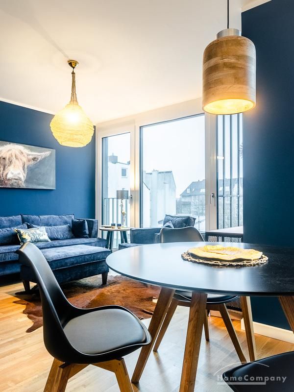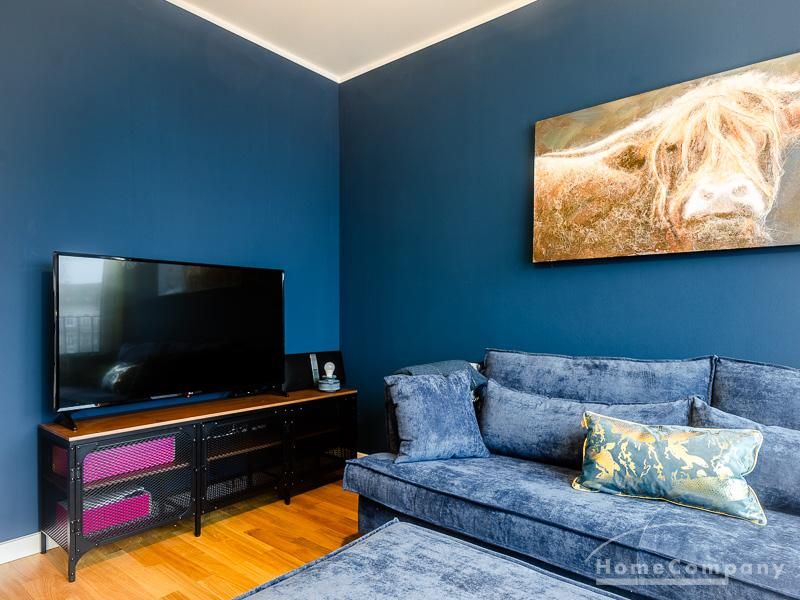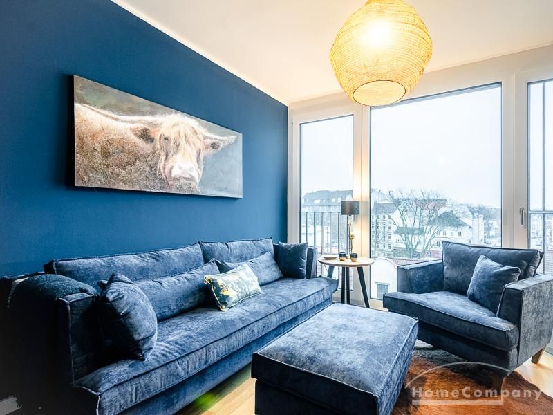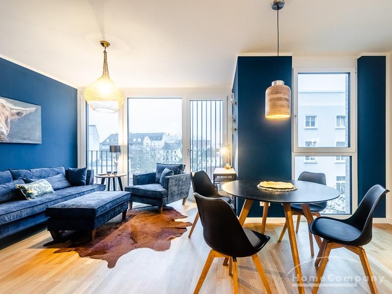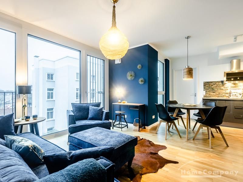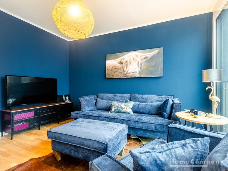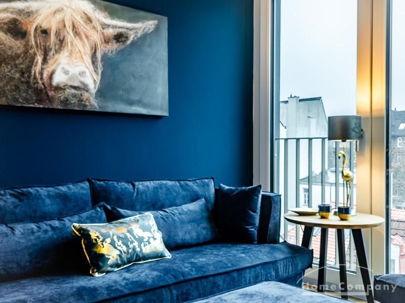 In Blau und Gold gestaltete Wohnung in guter Lage. Die neubautypischen Elemente, die bodentiefen Fenster, der Eichenparkettboden mit Fußbodenheizung und die moderne Haustechnik sorgen für zeitgemäßen Wohnkomfort, der durch die Stilvolle Gestaltung und Auswahl der Möbel ergänzt wird.