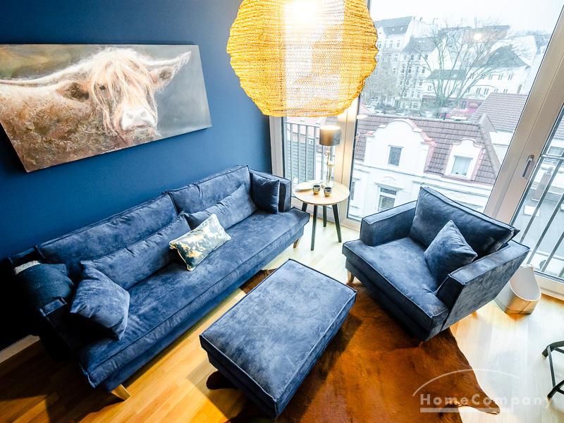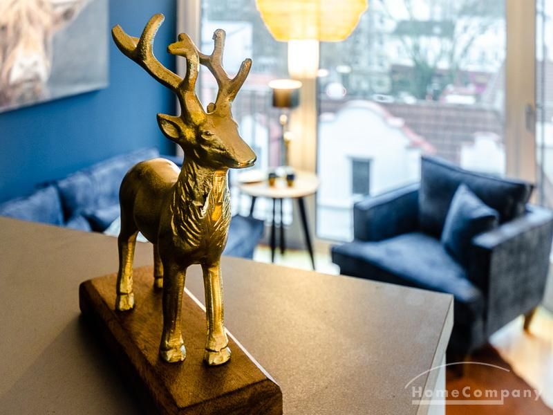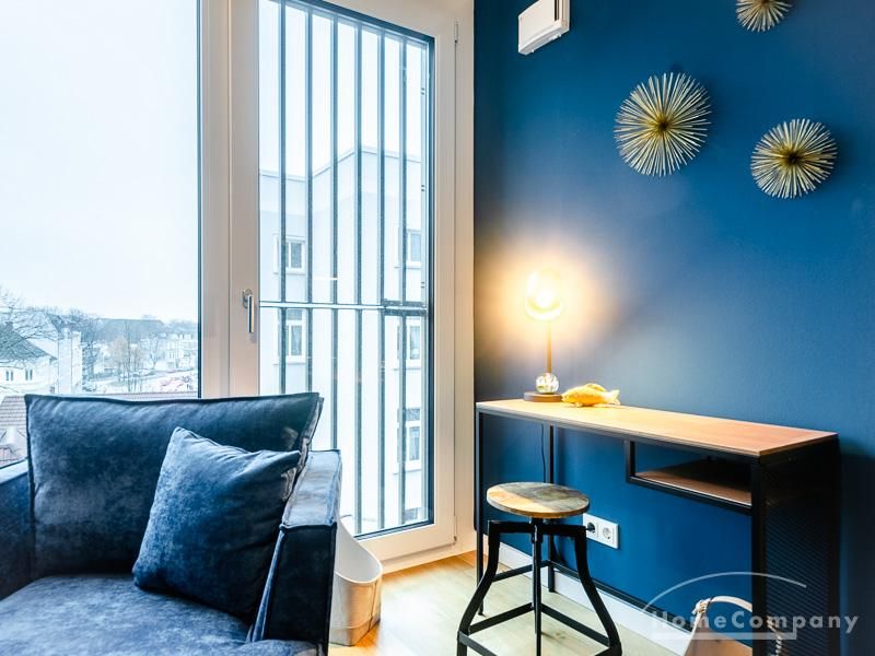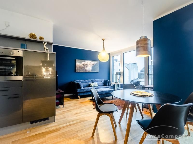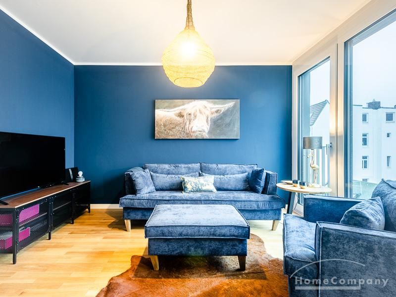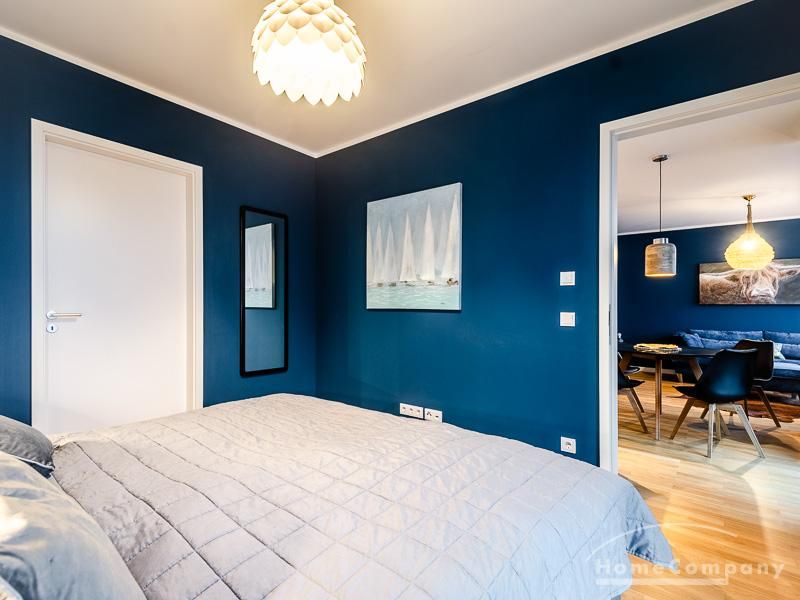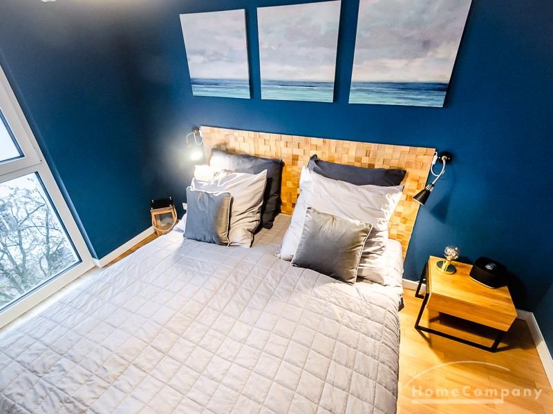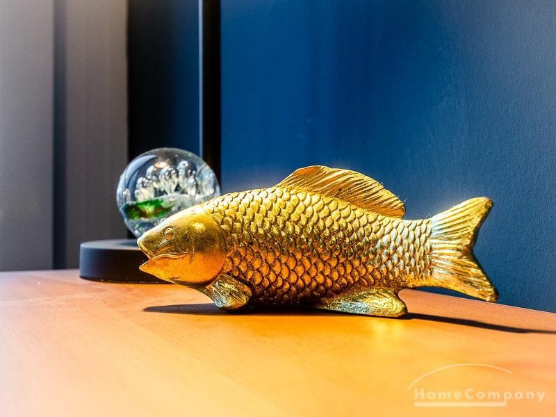 In Blau und Gold gestaltete Wohnung in guter Lage. Die neubautypischen Elemente, die bodentiefen Fenster, der Eichenparkettboden mit Fußbodenheizung und die moderne Haustechnik sorgen für zeitgemäßen Wohnkomfort, der durch die Stilvolle Gestaltung und Auswahl der Möbel ergänzt wird.