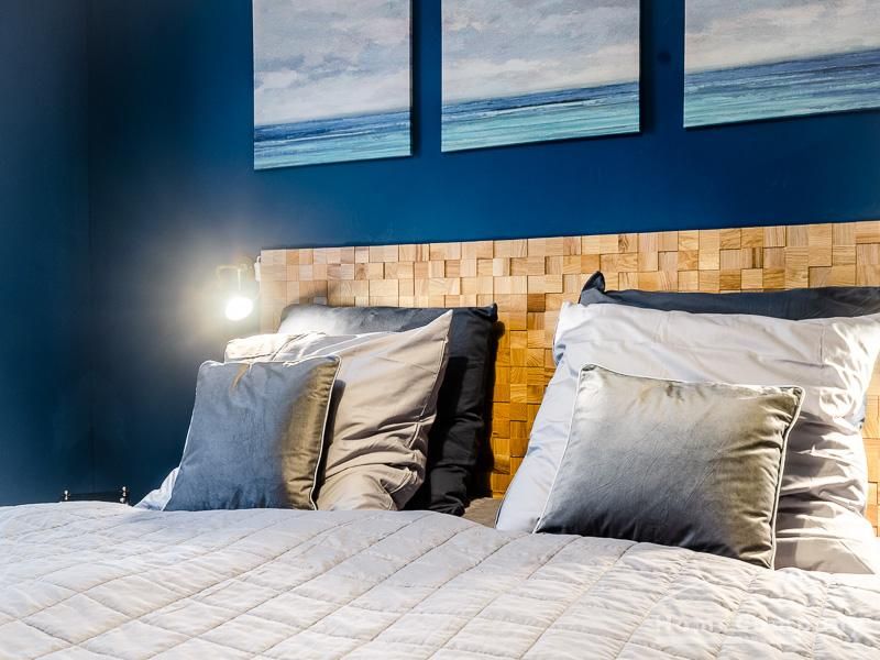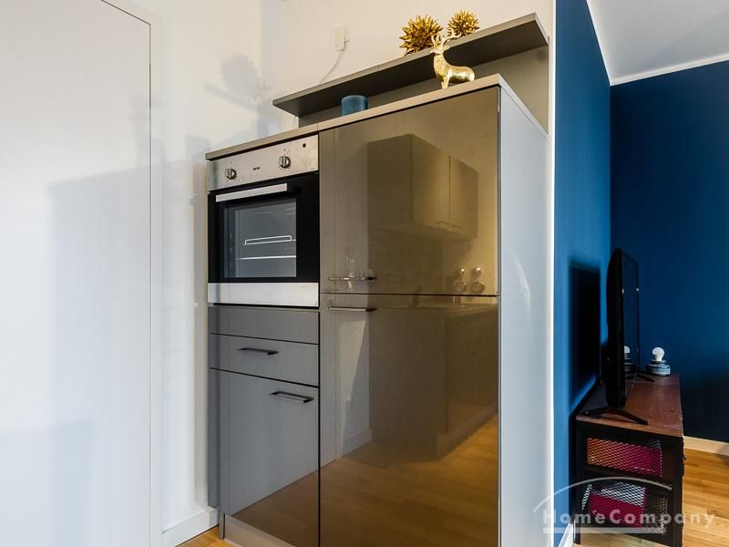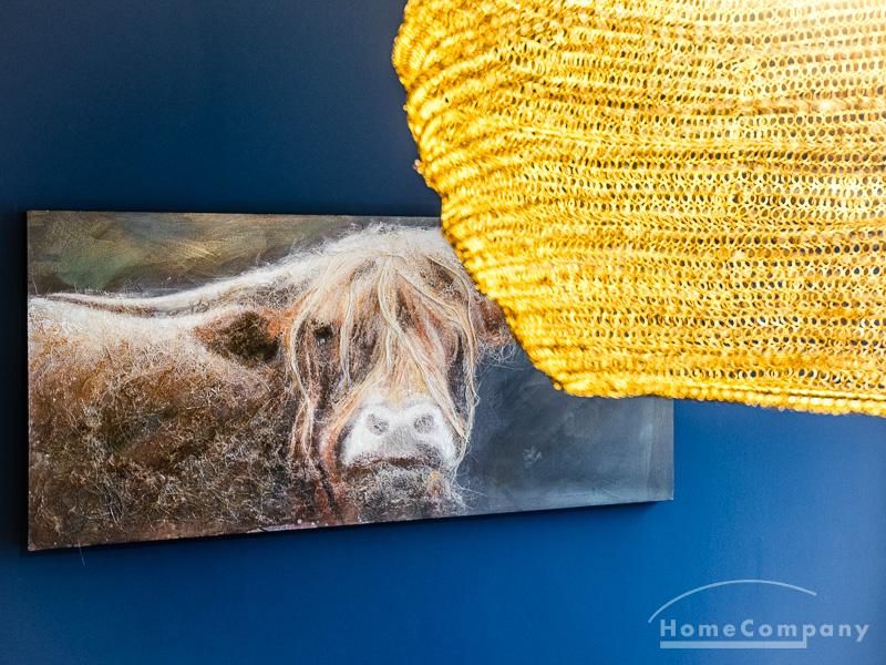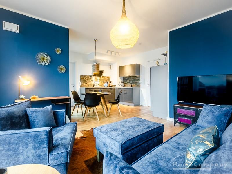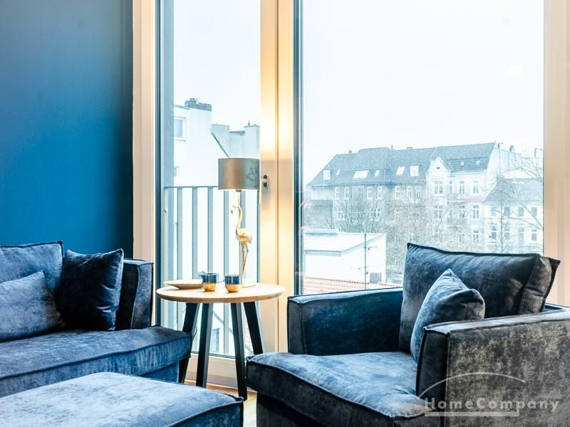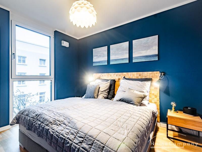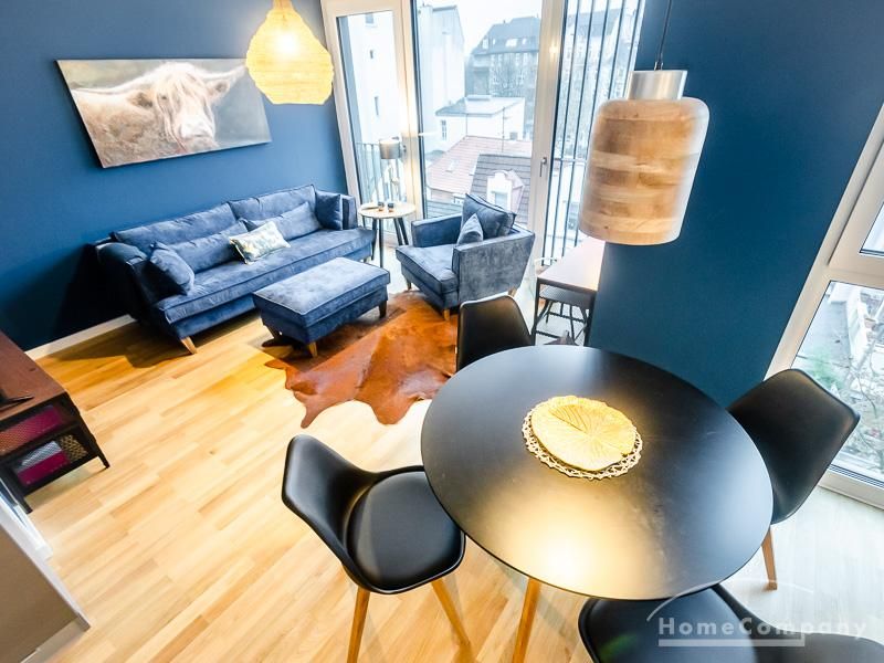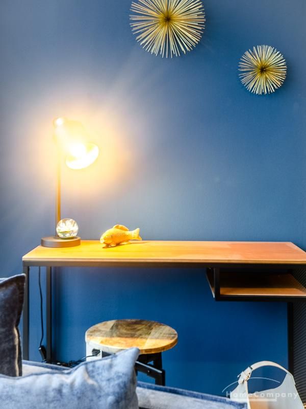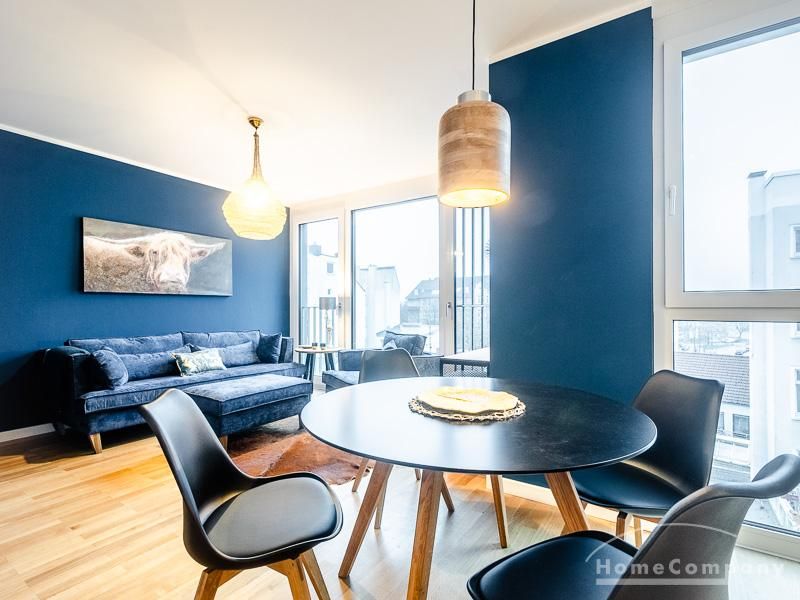 In Blau und Gold gestaltete Wohnung in guter Lage. Die neubautypischen Elemente, die bodentiefen Fenster, der Eichenparkettboden mit Fußbodenheizung und die moderne Haustechnik sorgen für zeitgemäßen Wohnkomfort, der durch die Stilvolle Gestaltung und Auswahl der Möbel ergänzt wird.